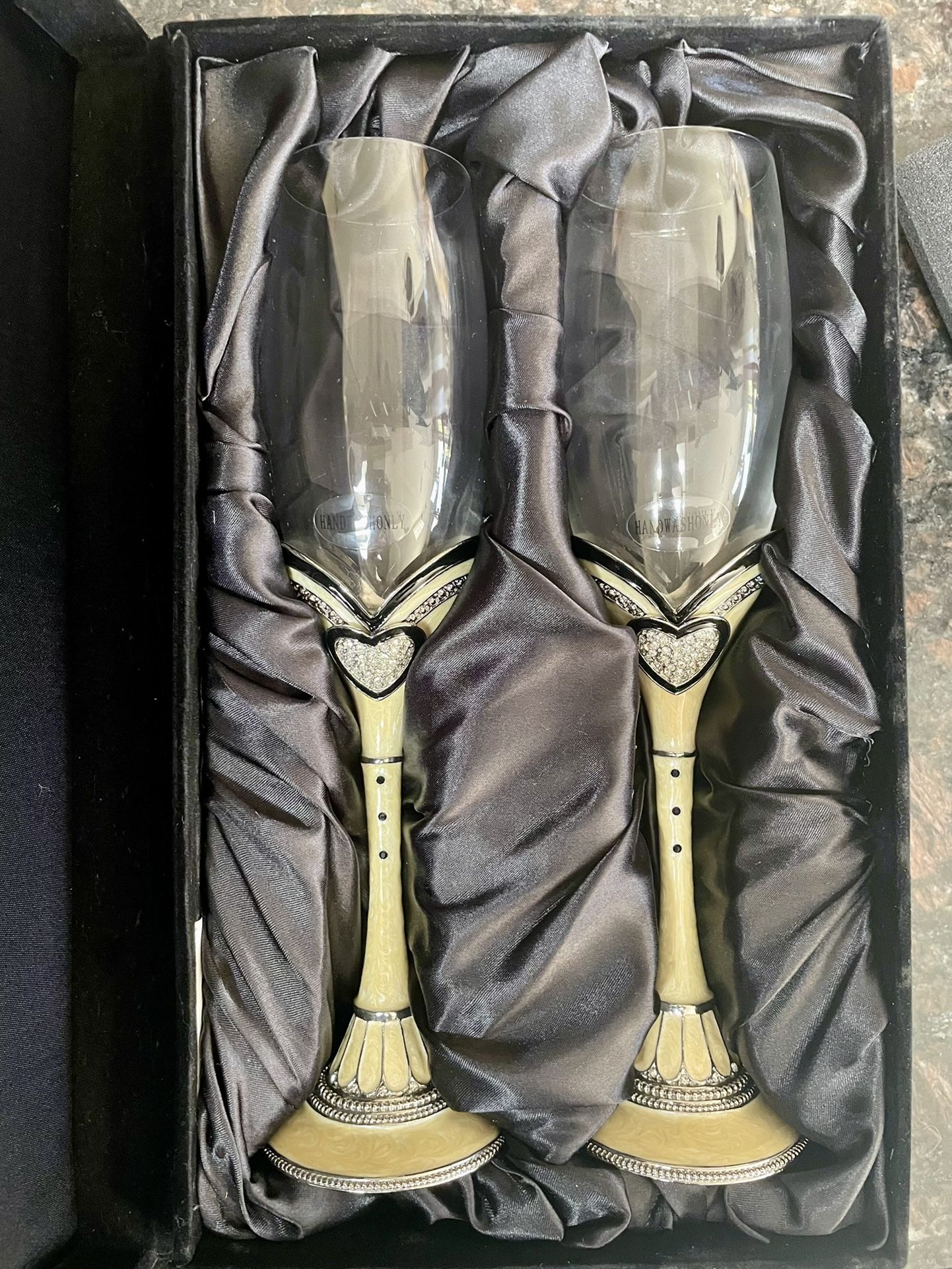 New/never used Champagne Flutes for wedding/anniversary. Very detailed, heavy and high quality flutes with hand laid inlays. Exclusive from Things Remembered. Can be custom engraved on the glass if you chose to have that done at a shop. Retails for over $250 for the set