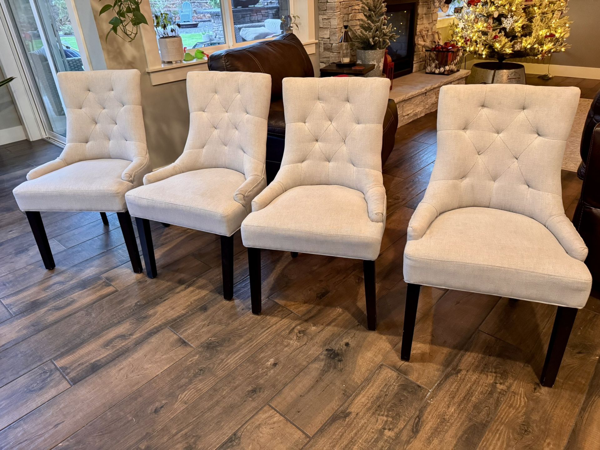 Four great condition, light heather grey upholstered dining chairs with black legs. Each scotch-guarded & easy to clean. Originally purchased thru Wayfair. Located near Lake Sawyer in Black Diamond/Maple Valley area.