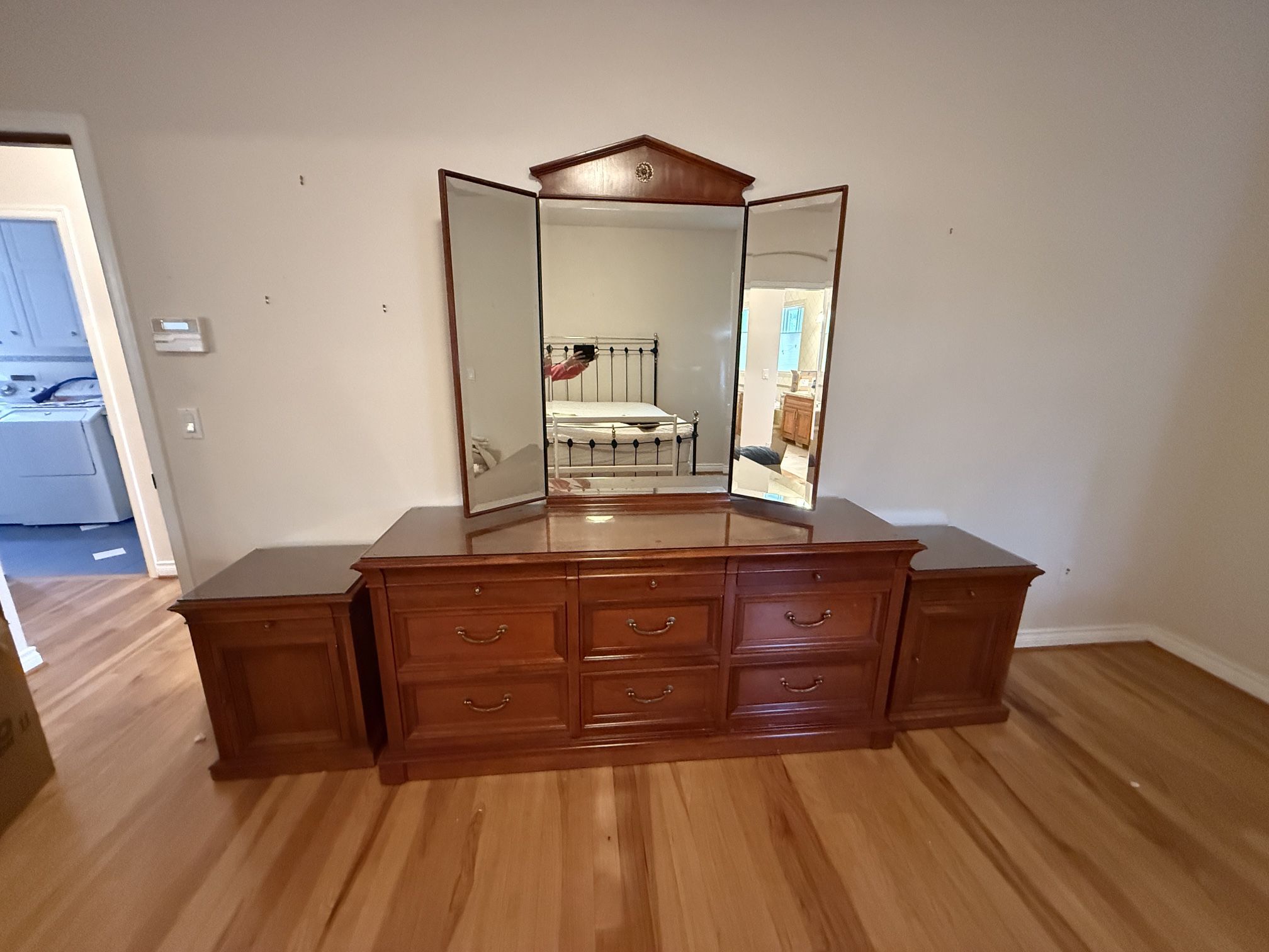 Elegant Vintage Ethan Allen Sable Medallion Collection Dresser, Tri-fold Mirror and 2 Night Stands The Sable Medallion offers traditional details along with ample storage. The elegant 9 Drawer Dresser, solid cherry wood, features include dovetail joinery, antiqued brass fittings and shallow accessory drawer. Structurally sound and in great condition; with custom glass top over top of dresser to preserve wood surfaces Attached is Tri-fold beveled mirror, movable for complete viewing. Two matching nightstands with top drawer with plenty of storage with shelf and door front closure. Also have custom glass top over top wood surfaces. Dresser: 72"l x 20"d x 32"h. Beveled mirror: 56"w x 52"w Nightstands: 21ʺW × 17ʺD × 26ʺH Preferred to sell as complete set of 4 pieces … dresser, 2 nightstands and tri-fold mirror $699 Local pick up / cash only