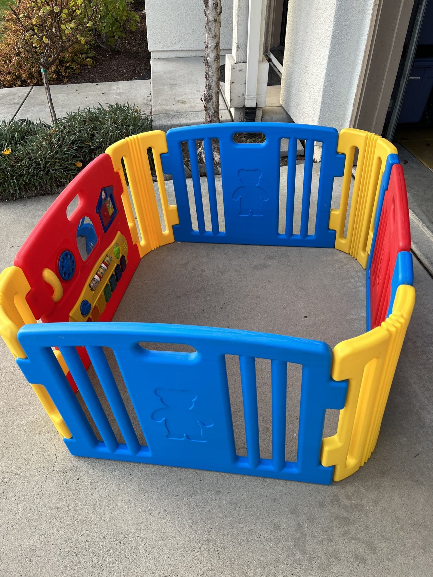 This is for **two sets** of baby gates, which can be used separately or combined to make an extra large play area. The pictures show dimensions for ONE set, but this price includes both sets. The battery-operated toys on the gates do not work, but the gates themselves are in reasonably good shape.