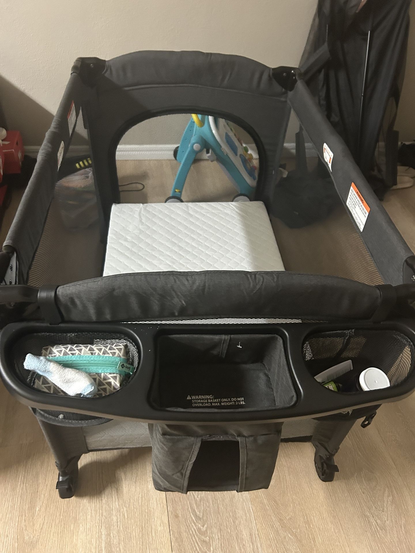 Barely used Acts as side sleeper and play pen Comes with storage bag , changing table and bottom rails ( mattress not included )
