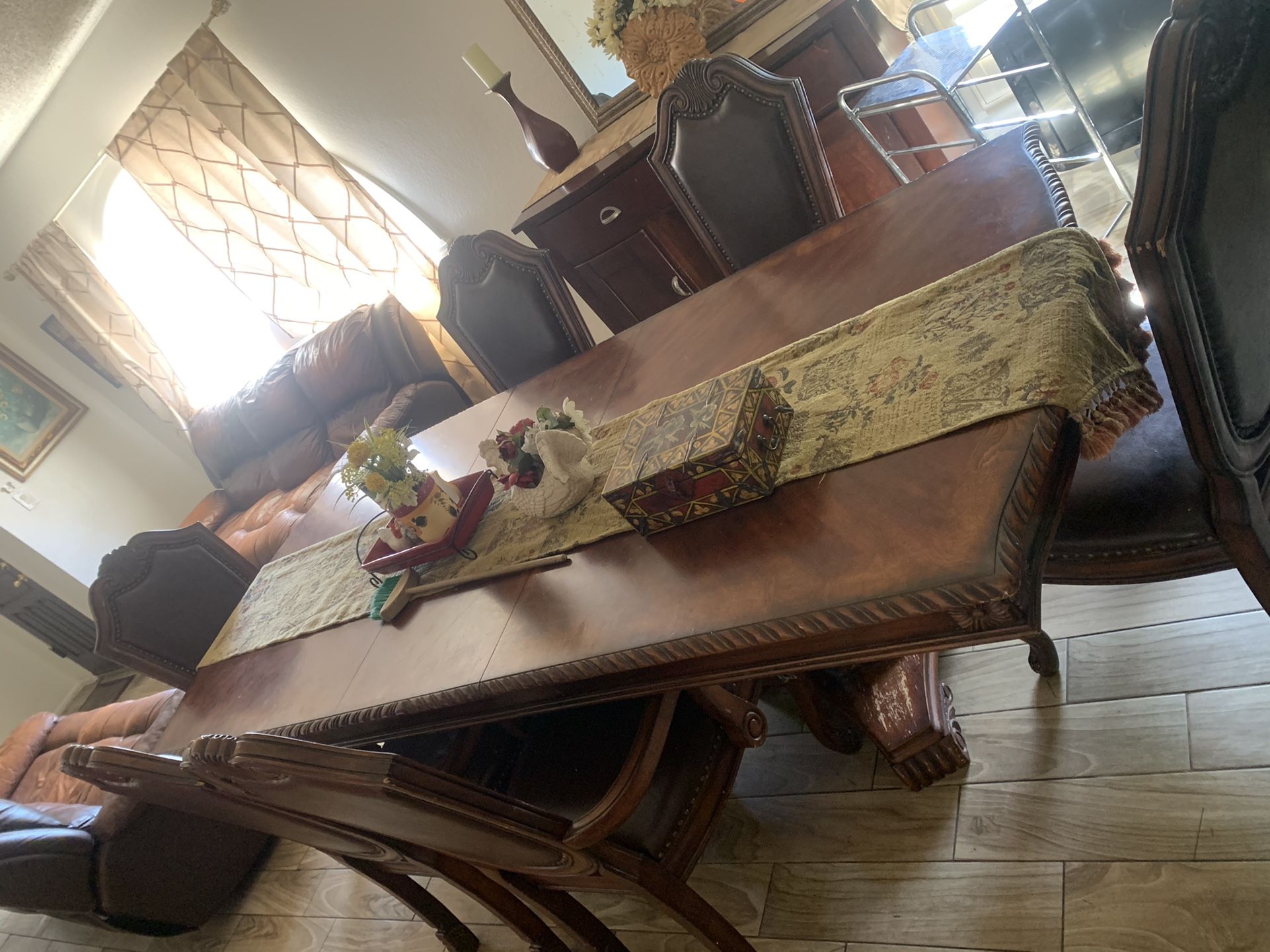 Beautiful heavy dining room table 6 Chairs Center leaf hutch and breakfast bar