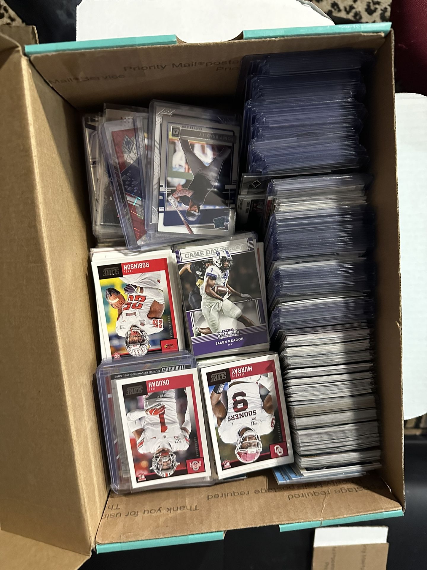 I’ltimate collection huge cards almost all rookies qb’s w/r’’s ultimate gift for someone that wants a investment collection to start or start a whatnot business haute teed to make well north of $5k open to trades car quad etc text Jason at six 3one 764 three 815