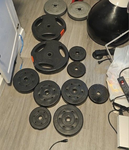 Not free 75 cents per lbs. It's 115 lbs total I have 4-7.5lbs 2-2.5lbs 2-20lbs 2-15lbs 2-5 lbs I also have an easy curl bar (I don't know how much it weights) for $25 Or $105 for everything (115lbs x $0.75=$86.25+ $25=$111.25)