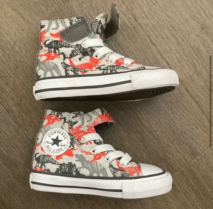 Chuck Taylor All Star Dinosaur print high top sneakers -New without tags -size 5 -Velcro enclosure and rubber soles Condition: new without tags. Never worn