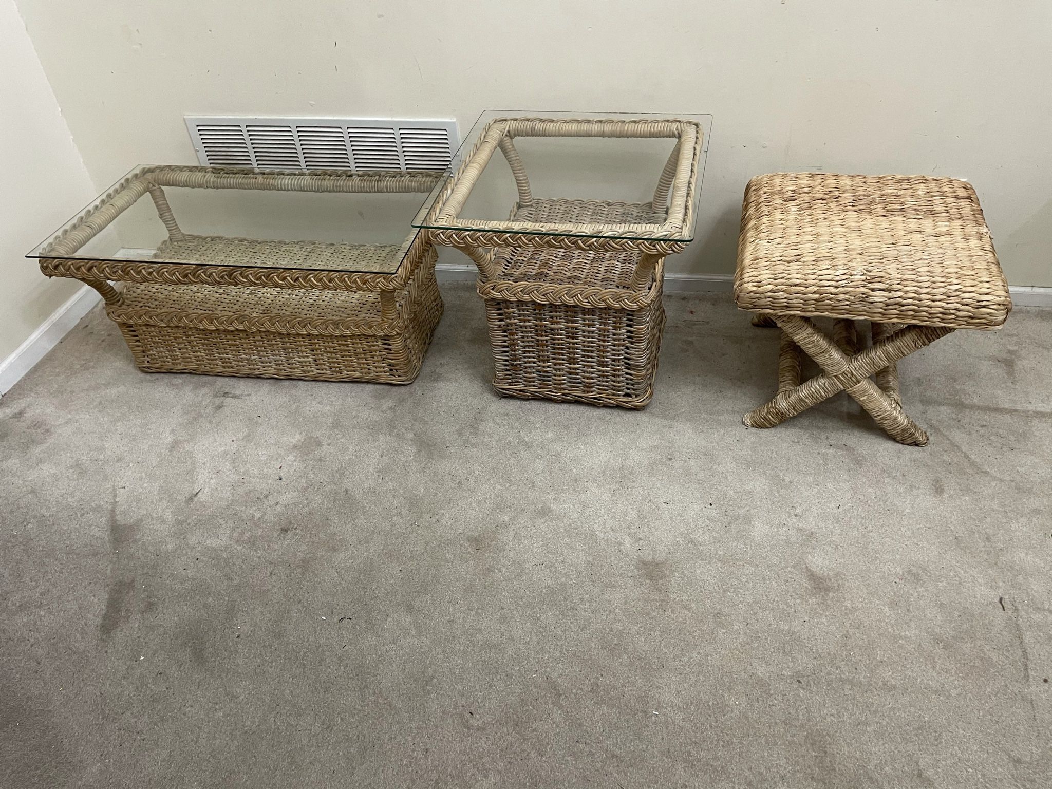 Glass Too Rattan Coffee Table, End Table and bench Measures Coffee Table L -37” W-20” H-17” End Table L-23” W-23” H-22” Bench L-20” W-20” H-17” Used, in good condition Motivated seller