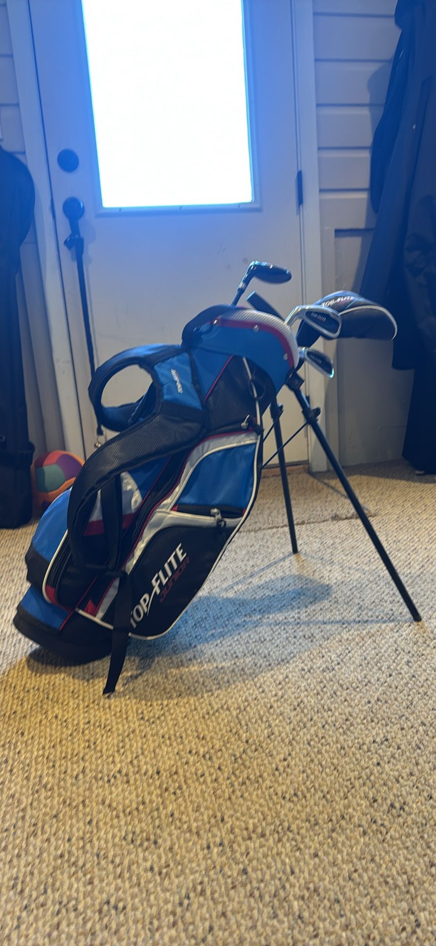 Boys Top Flight Junior golf club set. Color: royal blue & black Clubs: Driver, putter, 7 iron, sand-wedge, wood Has shoulder straps to carry like a backpack and kick stand.