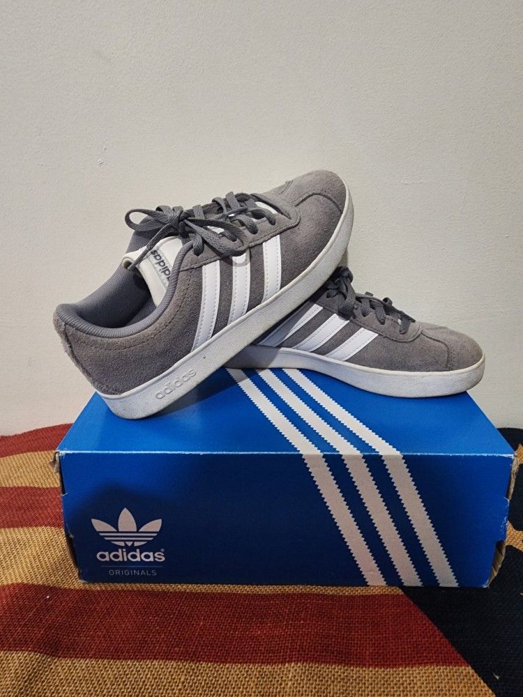 Grey Suede Adidas. Worn a handful times. I got Mel to switch to Nikes. Because I wear Nikes. She is mad to get rid of these shoes. They said they were lucky. I don't believe it. But if it gets you luck, why not! Can't guarantee you winning the lottery. I can guarantee you will look fly! $20 or obo.