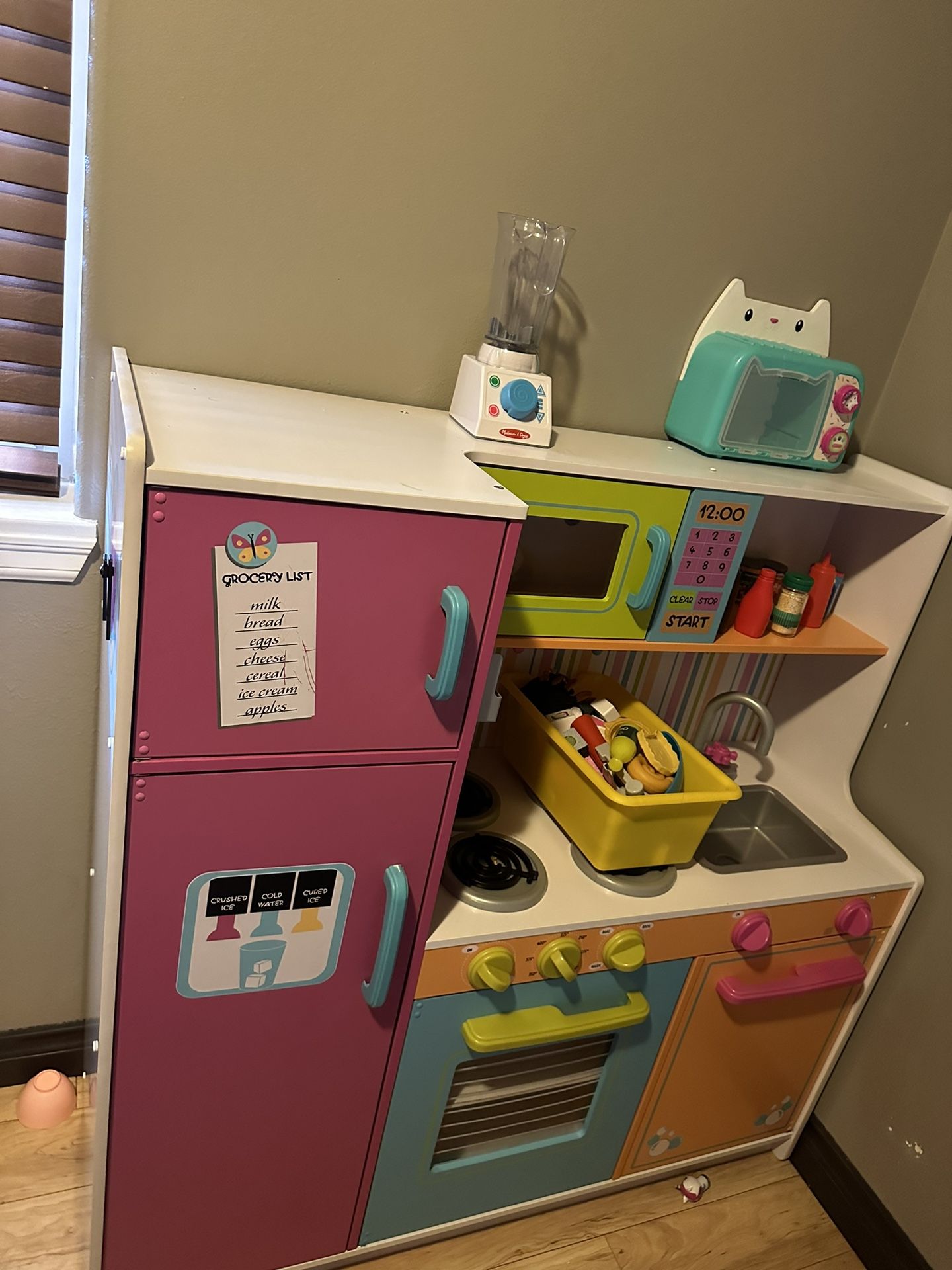 Play Kitchen with food, blender, gabby dollhouse mini oven, and utensils. Like new