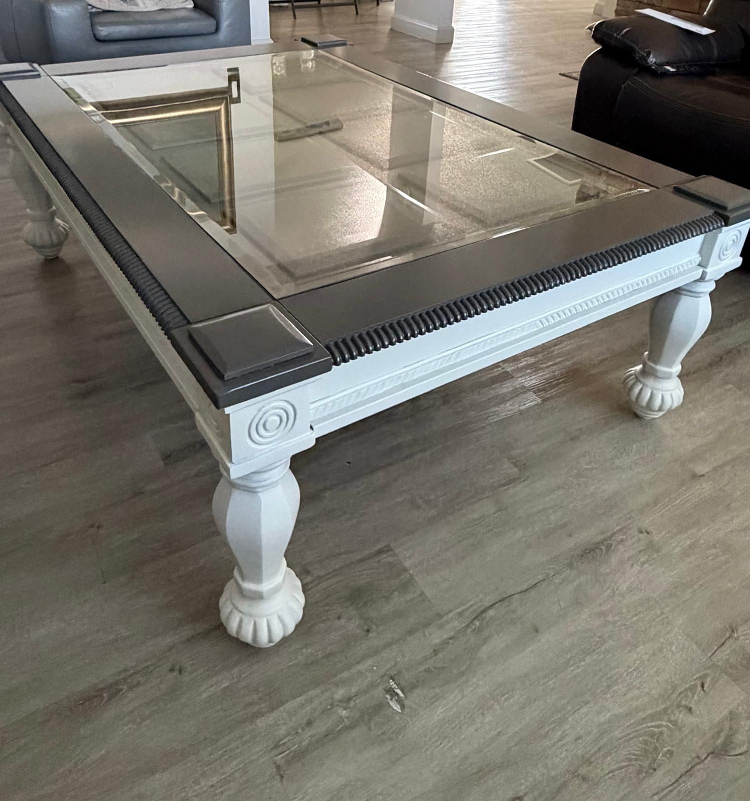 Solid wood center table recently refinished in gray and white color very strong and in very nice condition with glass on top