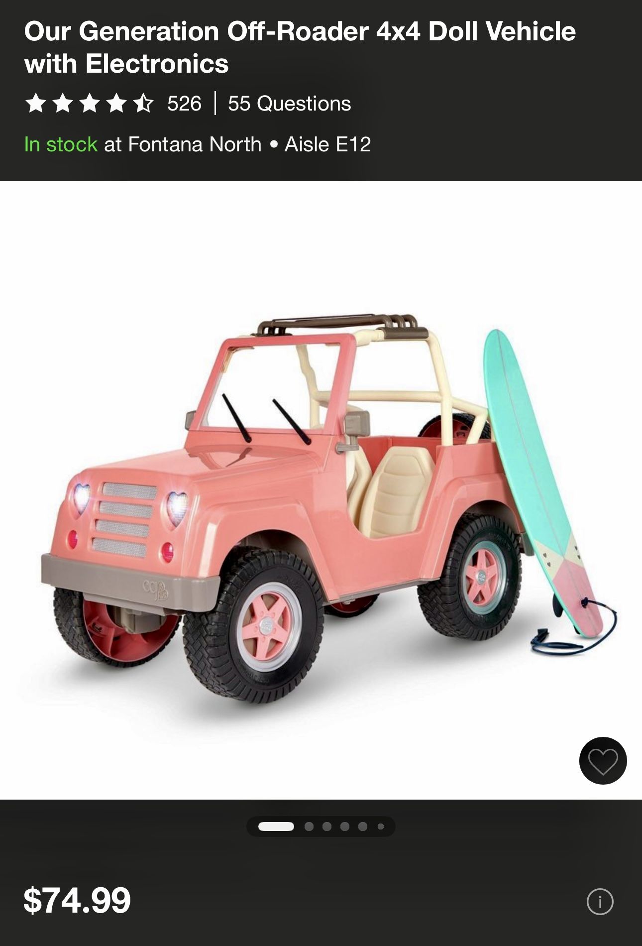 Slightly used, but it good condition. Includes 2 dolls, 4 outfits, Jeep, and Camper. • 4x4 Off Roader Vehicle Playset: Off Roader Jeep in Pink for 18-inch dolls! • Fun Features: Bluetooth speaker, FM radio, functional lights and wipers, and surfboard with removable roof rack! • Room for Friends: comfortably fits 2 Our Generation dolls with a pet for fun adventures together; includes a trailer hitch for connecting to the RV Camper and Horse Trailer! • Dimensions: measures approximately 17.9” (H) x 12.5” (W) x 26.14” (L); fully assembled. • Mix & Match: compatible with most 18-inch dolls and accessories. • Recommended Age: suggested for kids ages 3+ (small parts).