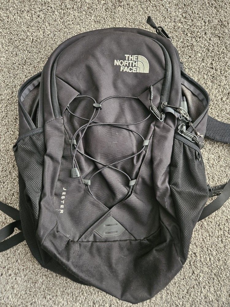The North Face Jester backpack in black. Comfortable FlexVent suspension, padded laptop sleeve, multiple compartments, and mesh pockets. Great pre-owned condition with light normal wear and a faint mark on the bottom visible in photos. Fully functional and clean overall. Perfect for school, travel, or everyday carry.