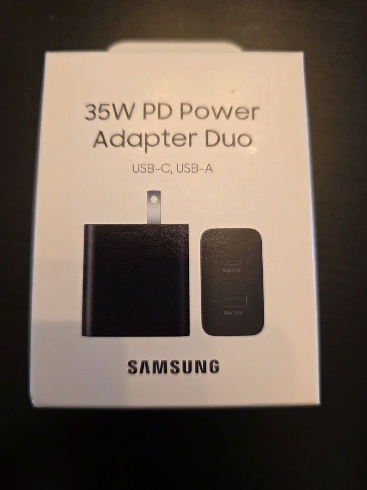 Samsung 35 watt PD power adapter Duo. This is a genuine OEM Samsung power adapter that has a usb-c and usb-a port. Excellent working condition.