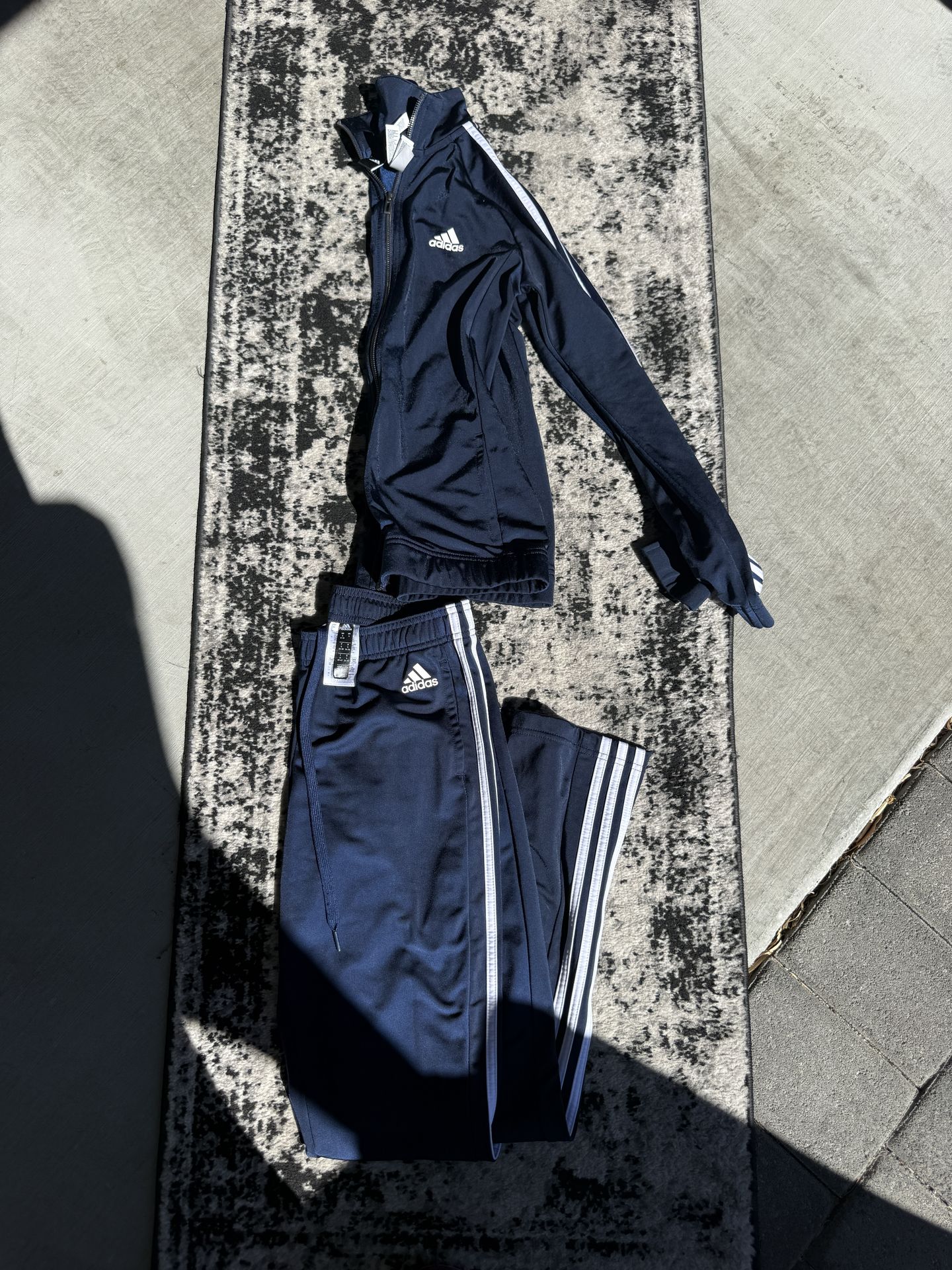 Adidas Navy 3-Stripe Tracksuit Set – Size Small Matching zip-up jacket and track pants set in navy blue with white stripes. In great condition, no stains or rips. Super comfy and perfect for the gym, errands, or lounging. Size: Small (both pieces) Brand: Adidas ✨ Open to reasonable offers ✨ Bundle with other items on my page for a discount ✨ Message me with any questions