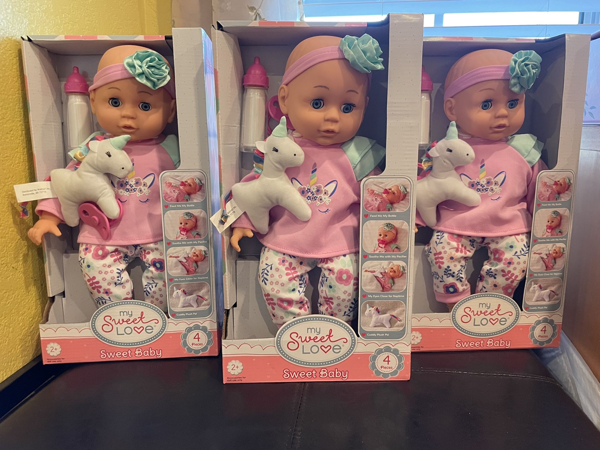 4 piece baby doll set. 14 inch doll comes dressed in her pjs with a unicorn plush, pacifier and bottle. 1 for $7 2 for $12 3 for $15 One model available Pick up in Northridge Toy toys girls boys toddler