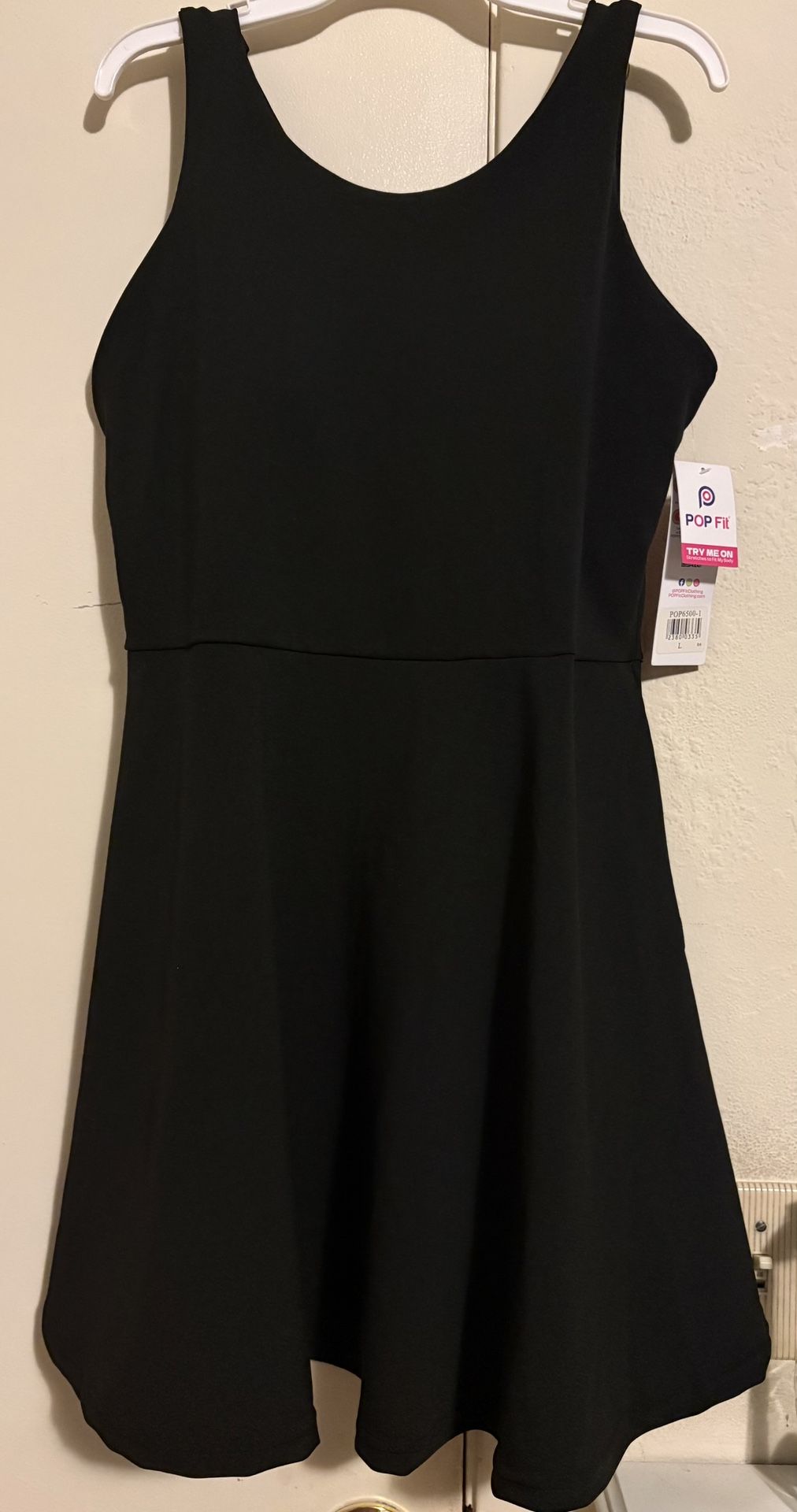 Brand new POP Fit Flare Dress. Super cute black sleeveless dress with a criss-cross back design, built-in shelf bra with removable pads, attached shorts and FUNCTIONAL pockets! Size Large. Measurements for L are Bust 38-40 inches, Waist 33-36 inches, Hip 43-46 inches. Still has tags on it.