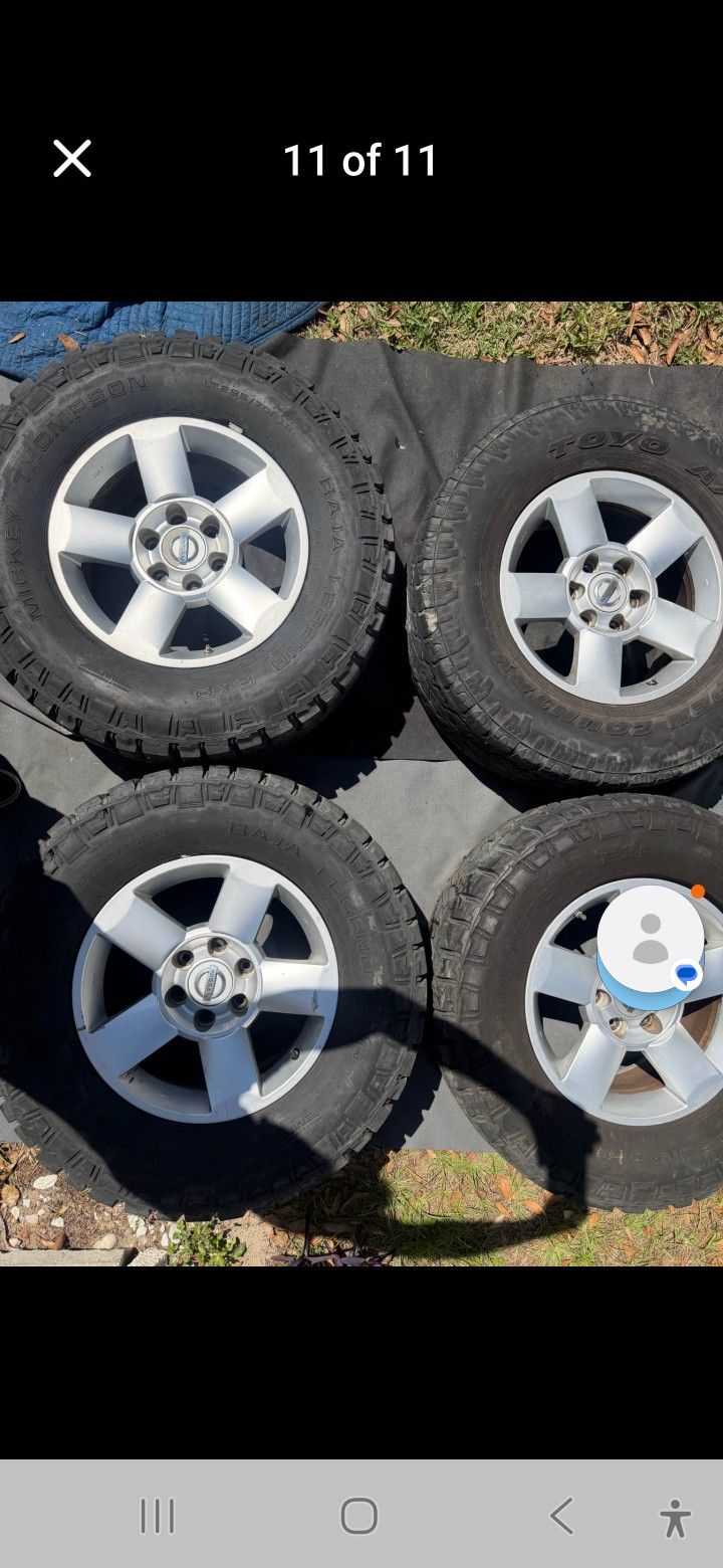 Set of 18 Inch Rims And Tires OEM Solid Aluminum for Nissan Titan, no bends or cracks. Rim Size 18x8 inch. ET25. Lug pattern 6x139.7mm or 6x5.5 inch. All have 18 inch Mickey Thomson Tires tread 3 around 90%, 4th getting bold LT295 70 18 inch