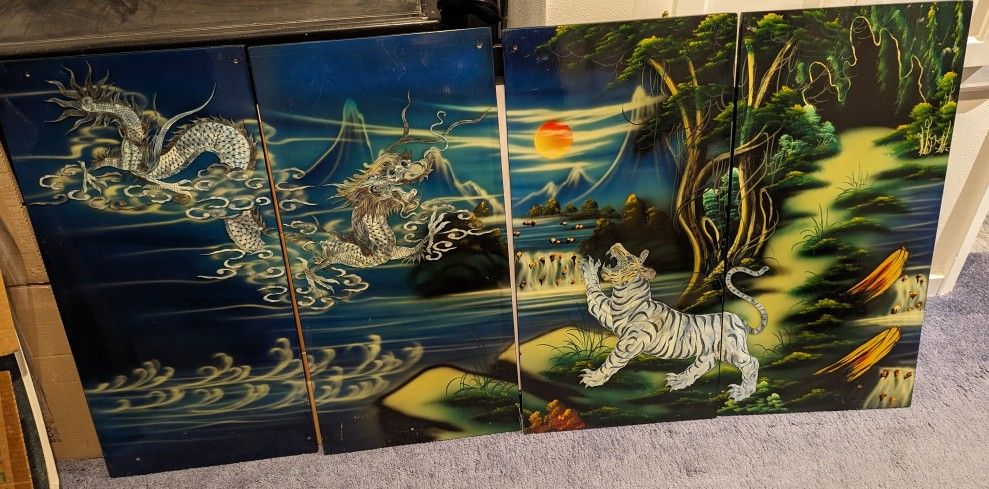 Each of these pieces are 16 x 31. They are done on solid wood I believe with lacquer and an inlay of maybe shell or cloisonne. They are very pretty. There is some very minor scratching near the tops. Not easily seen one on the wall.