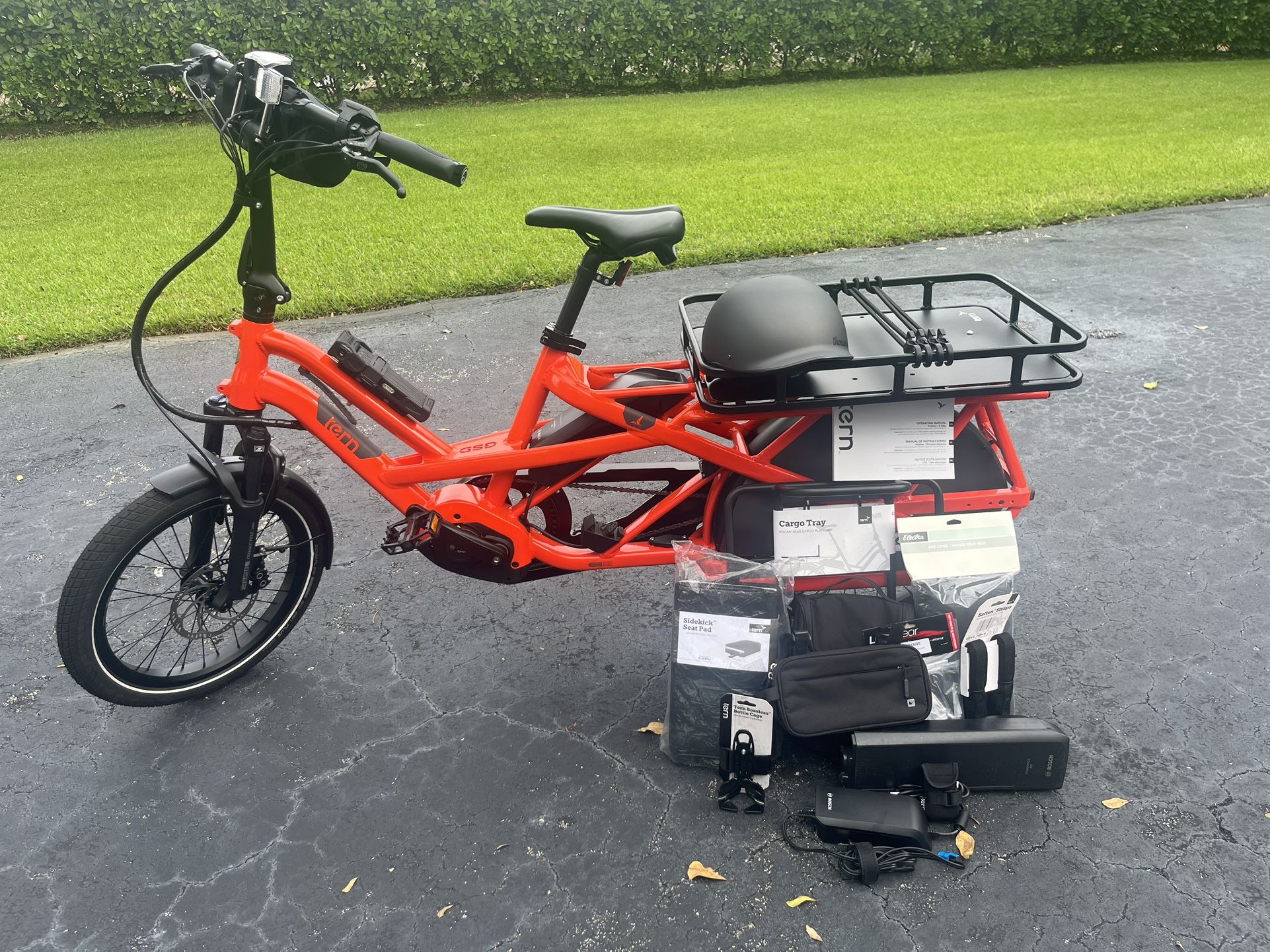 Tern GSD S10 Folding Electric Bike Brand New- only 8 Miles! Built to carry 2 kids & Groceries 440Lb Max Gross Weight Dual Bettery System (range 121 Miles) Bosch Motor Bosch Dual Battery System All Accesories Included: Original Price listed - all items brand new and unused. Thousand Heritage Bike Helmet 2.0 $100.00 Extra Battery $100.00 Tern VALO 2 Headlight $60.00 Tern Sidekick SeatPad $55.00 Tern Bossless Bottle Cage $30.00 Tern pocket tool kit $55.00 Tern Cargo Tray $85.00 Tern Batten Sraps $20.00 ABUS bike lock $114.00 Lycan Gear -Smartphone Holder $22.00 Electra Bike Cover $50.00 Rhino Walk saddle bag set $50.00 Lumier Handle bar bag $21.00 ***Extra bike cover