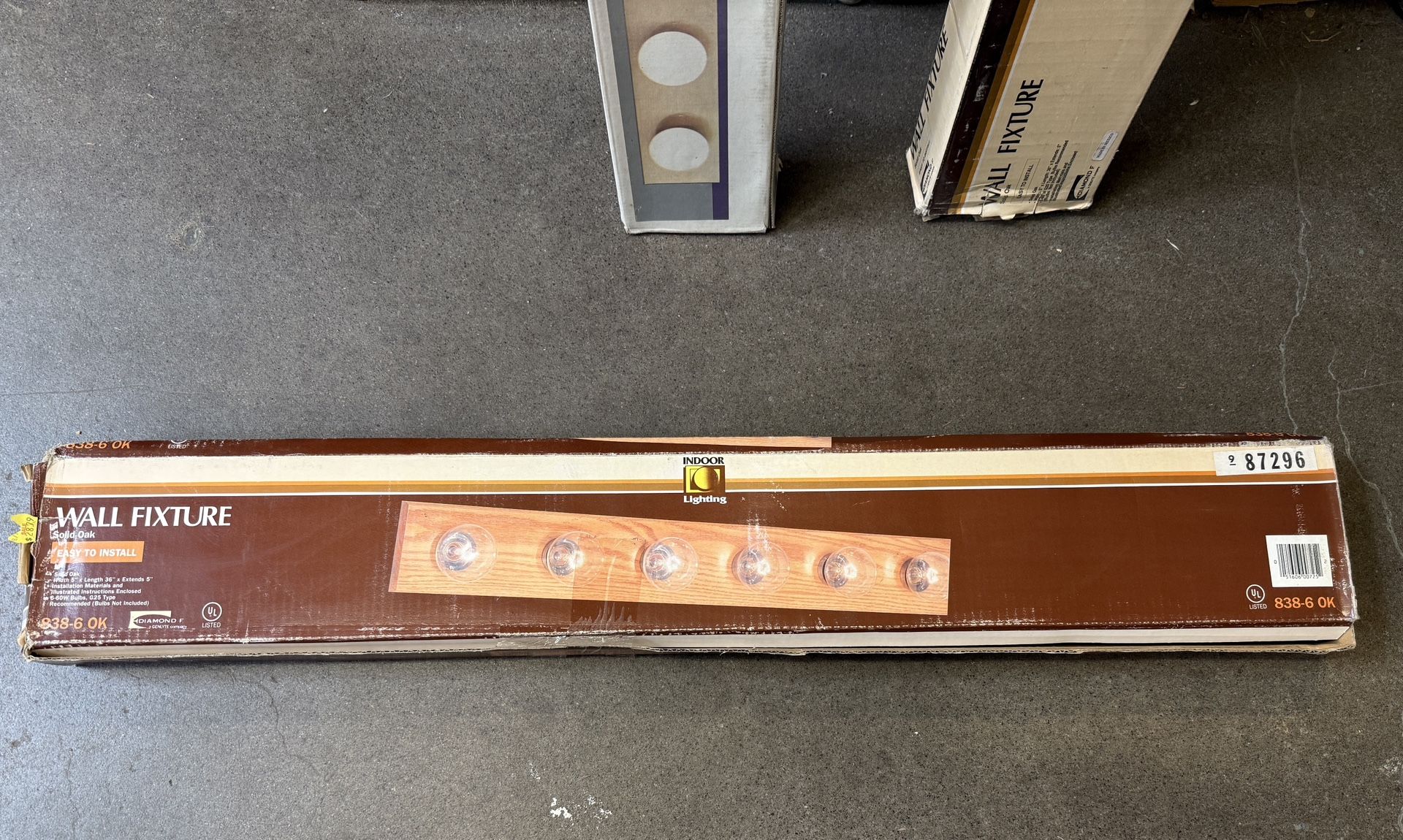 New in Box Solid Oak 6-Light Bathroom Light Bar 36”x 5” Pick up at RECLAIM NW located at 7639 SE Foster Rd. Portland, OR 97206 HOURS: Tues.-Fri. 8:30-5pm / Sat. 10 - 5pm / Sun. 11 - 5pm / Mon. closed