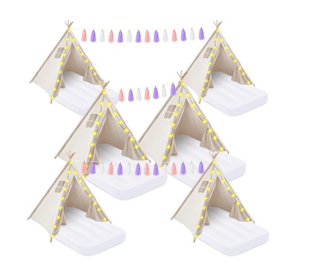 Great for a slumber party, birthday party, sleepover at grandmas house or little reading nooks for classrooms. Comes with teepees, sturdy blowup mattresses, lights for each teepee, sheet for each mattress and decorations. See photos -one 3 ft dowel needs to be replaced, otherwise in great condition. Retail is $240, asking $100
