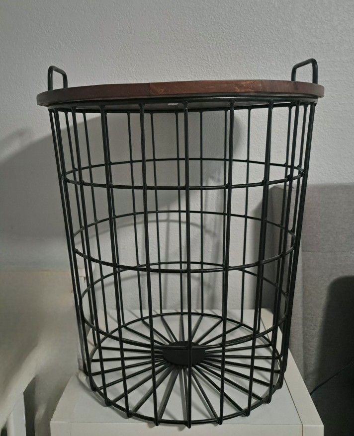 Wooden tabletop, solid wood, made in India. Wire basket, sturdy and both in great condition. Can be used in bedroom or living room. No water marks; excellent condition. 19in lid 14in bottom of basket 19 1/4in tall $30 obo. SDSU / University area pick up.