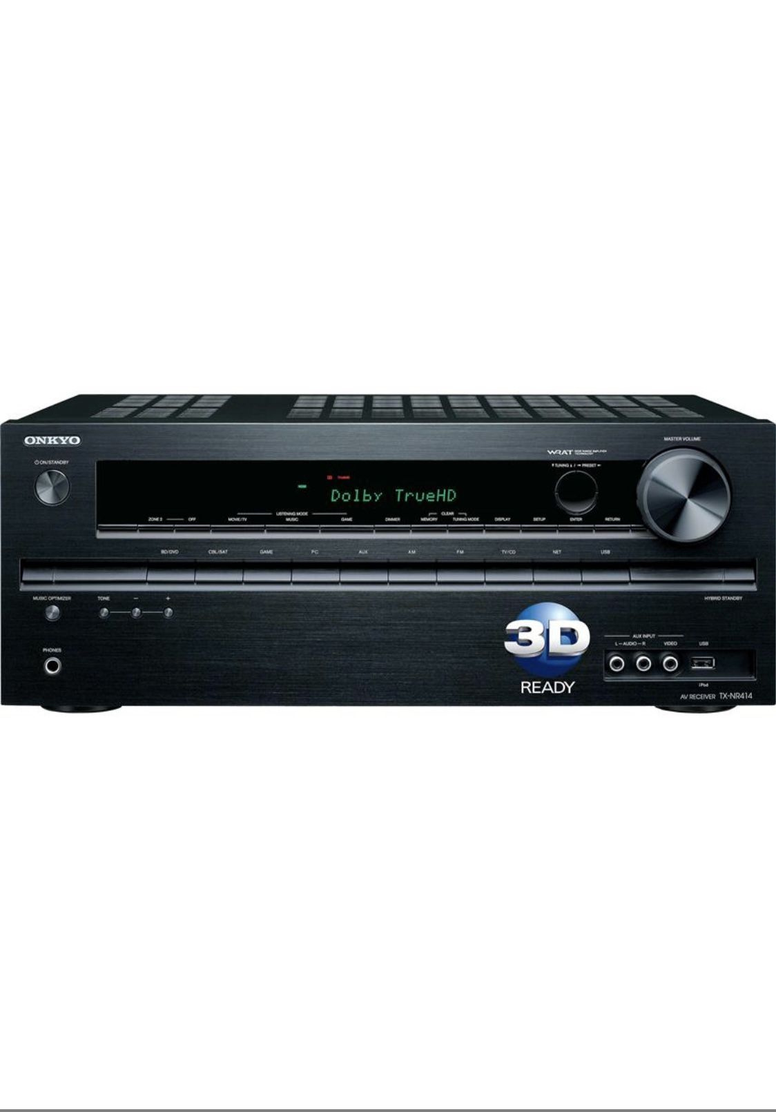 Highlights: Power and Processing: 5-channel amplifier 80 watts per channel into 8 ohms (20-20,000 Hz) at 0.7% THD, with 2 channels driven Dolby® TrueHD, DTS-HD™ Master Audio, Dolby® Digital Plus, DTS-HD™ High Resolution Audio, Pro Logic® IIz Digital Music Options: direct digital connection of iPod®/iPhone® through front-panel USB input allows music control via receiver's remote Internet-ready — access music from your PC and Internet radio stations online streaming for Spotify®, SiriusXM Internet radio, Pandora® Internet radio, Rhapsody®, vTuner Internet radio, and more (some services may require registration and subscription fees) Onkyo's free remote app includes wireless music streaming from your Android device DLNA (Digital Living Network Alliance) certified to ensure optimal compatibility with other network-enabled equipment Wi-Fi ready, requires separate Onkyo Wi-Fi adapter Bluetooth integration (requires optional optional Onkyo adapter) Multi-room Audio: dual-room/dual-source output line-level stereo audio output for 2nd room requires separate amplifier or powered speakers only analog audio sources can be played in the 2nd room Audio Performance Features: high-current amplifier design with massive power transformer 192kHz/24-bit Burr-Brown digital-to-analog converters for all channels direct mode switches off unnecessary circuitry to provide cleaner sound Music Optimizer function enhances the sound quality of compressed music files Connections: 1080p-compatible HDMI digital video switching (6 in, 1 out) HDMI version 1.4 with support for 3D video, Audio Return Channel, Deep Color, x.v.Color, auto lip-sync, and HDMI-CEC Audio Return Channel function receives digital audio signals from a compatible HDTV's tuner via HDMI component video switching (2 in, 1 out) digital audio inputs: 2 optical and 2 coaxial 5 audio/video inputs, including: 1 front-panel input with composite video 4 rear-panel inputs with composite video 1 audio-only input no phono input — to connect a turntable you'll need to add a phono preamp Ethernet port for for connection to home PC network 1 pair of main speaker outputs preamp output for a powered subwoofer General Features: Onkyo's free remote app lets you use your iPod touch®, iPhone®, iPad®, or Android™ device as a Wi-Fi remote convenient on-screen display (via HDMI only) InstaPrevue™ displays live video thumbnails of content available on your HDMI devices 40 AM/FM/SIRIUS presets multibrand remote 17-1/8"W x 6-13/16"H x 13-3/8"D weight: 16.5 lbs. warranty: 2 years 60-day returns MFR # TX-NR414 Item # 580TXN414 Works perfect, no problems.