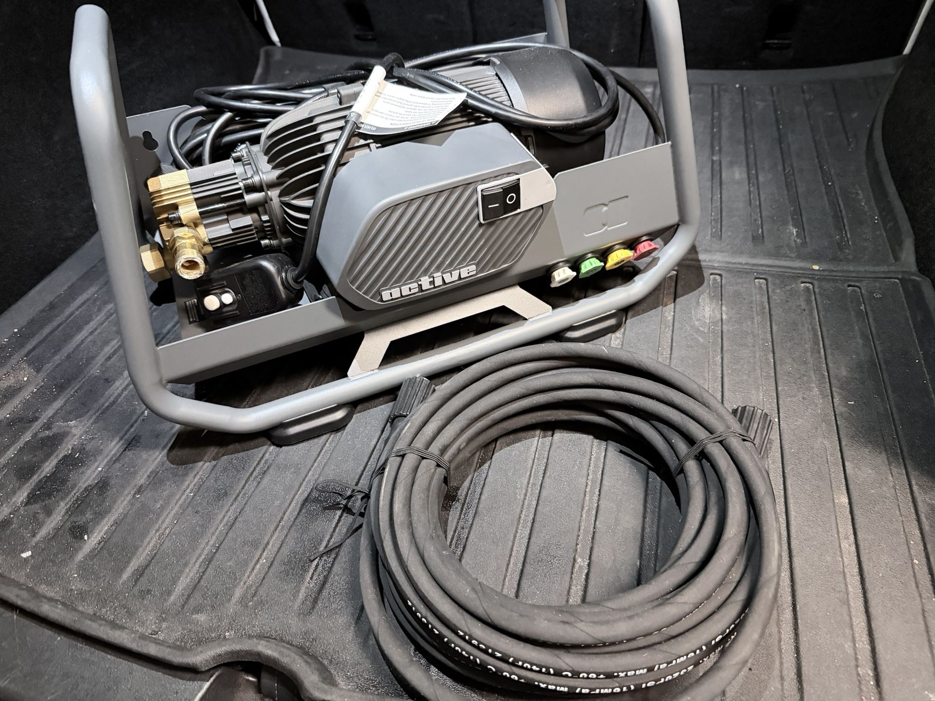 This is used but in EXCELLENT condition pressure washer. Comes with all nozzles included and Still under warranty until May 1, 2026 from active The 2.3 comes equipped with an updated brass endplate 5-Piston Pro Pump and a 128 Induction motor, which gives you 2.3 GPM at 1100 PSI. The combined operating output of 2,500 cleaning units will make any cleaning task a breeze. Seriously this machine packs a punch! Product Specifications : Charging Voltage: 120V/60Hz; Rated Current: 14A; Power Cord: 35 ft. 14 AWG with GFCI Maximum Pressure: 1500 PSI Working Pressure: 1100 PSI Water Flow: 2.3 GPM Dimensions: With frame: 20.5 x 11.5 x 12.25 inches (520 x 290 x 310 mm) Without frame: 17.5 x 9 x 6 inches (444.5 x 228.6 x 152.4 mm) Weight: With frame: 45.5 lbs (20 kg) Without frame: 29 lbs (13 kg) Motor: 128 Induction Pump: Patented 5 Reinforced Brass Piston Hose: 40 ft. Rubber with M22-14 connectors Soap Application: 750 ml Foam Blaster Gun Assembly: Metal Construction Switch: Rocker Switch