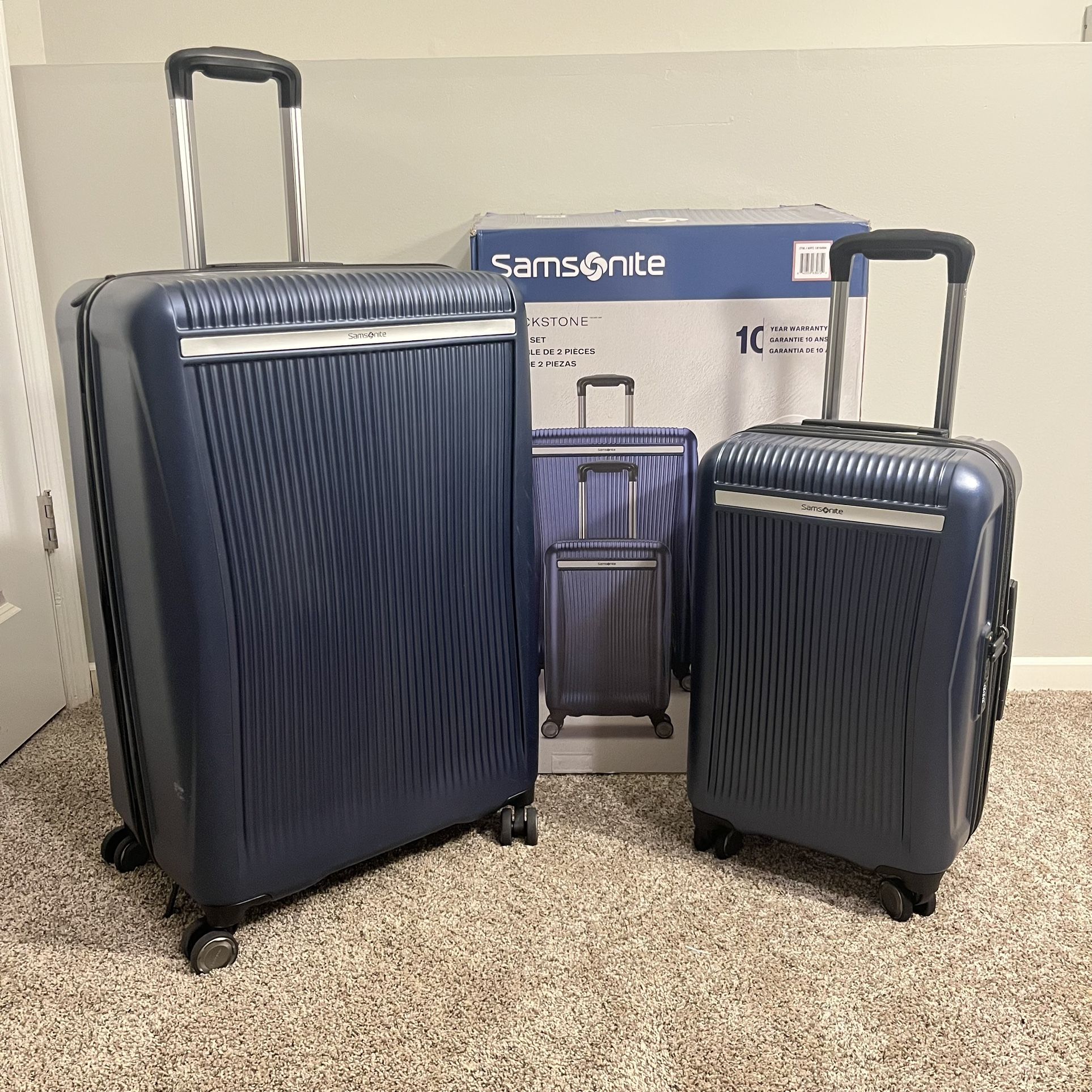 Retail price $250 +taxes Like New Condition - A couple very minor scuffs on the exterior, shown in pictures - Carry on is brand new! - Blue color - Durable and lightweight - Shock resistant smooth and quick wheels - Polycarbonate shell Large Expandable Spinner 30” H x 19” W x 13” Depth Carry On 22” H x 13” W x 8” Depth I have more options available as well if your looking for a different color or brand