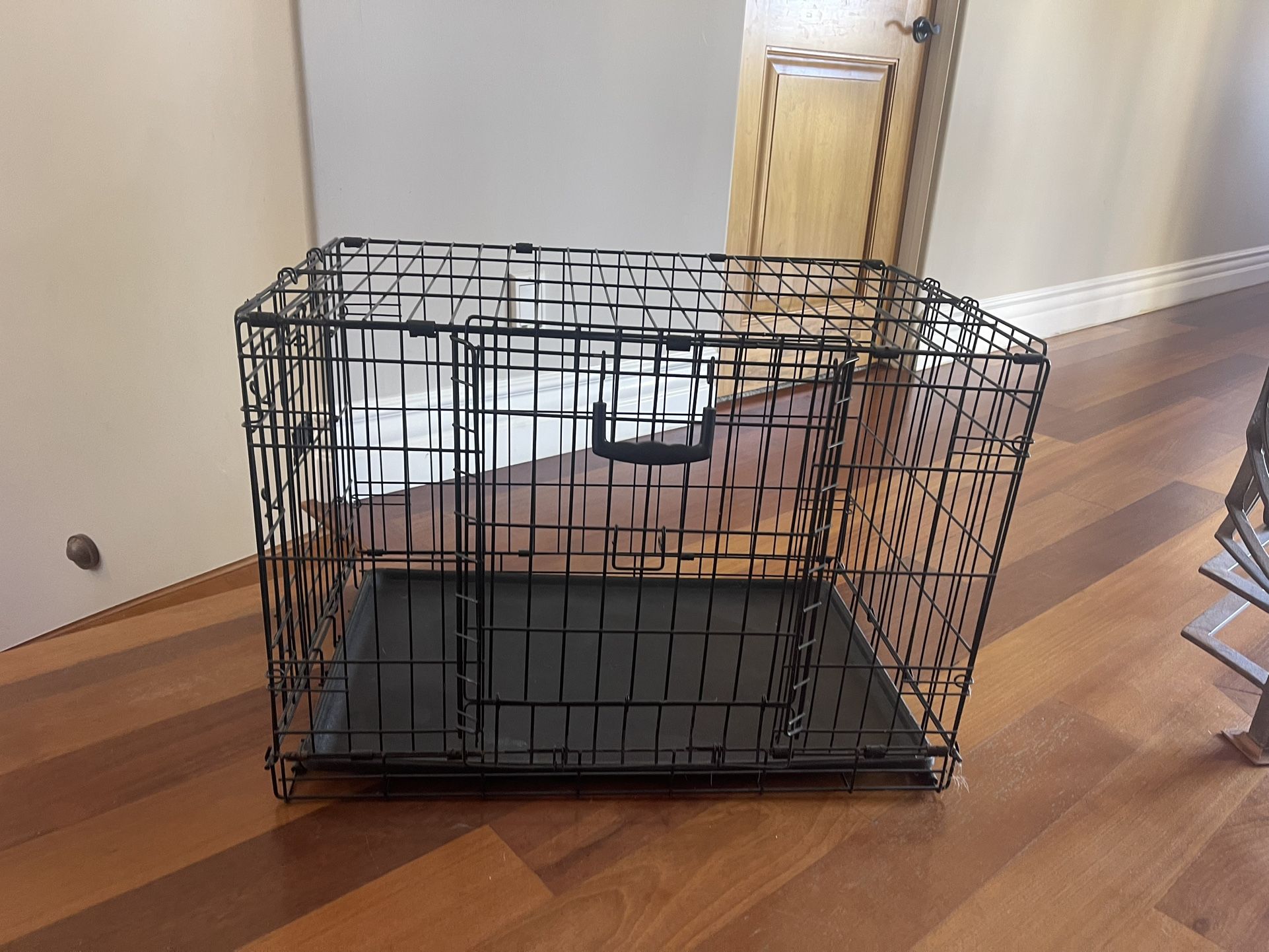 I have a lightly used foldable metal wire dog crate for small to medium sized dogs. It has two doors, a detachable divider (not pictured) and a tray for easy cleanup.