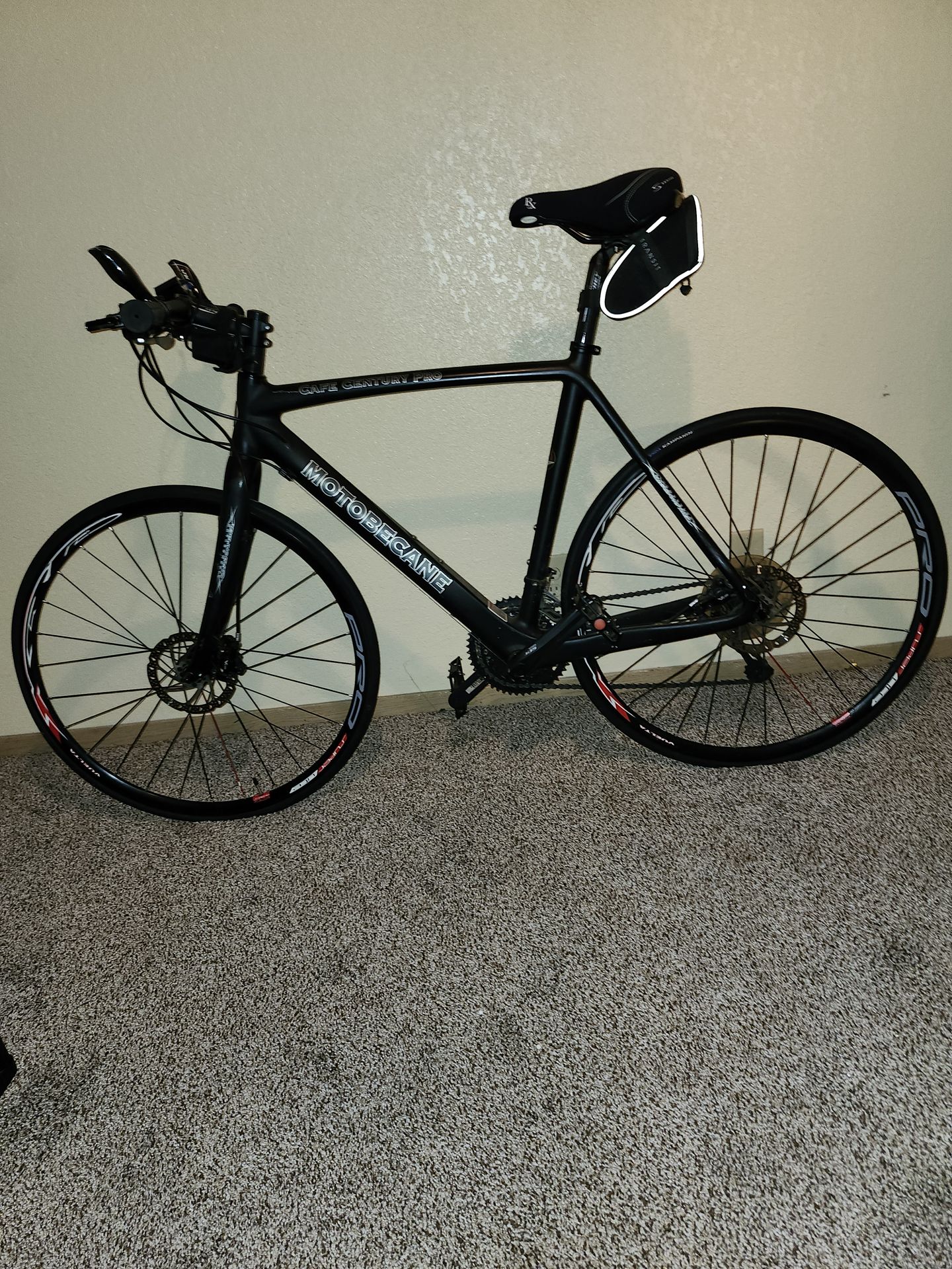 Motobecane Cafe century pro. All carbon fiber. Disk hydrolic brakes custom pedals, gel seat, rear pouch. Very nice road bike.