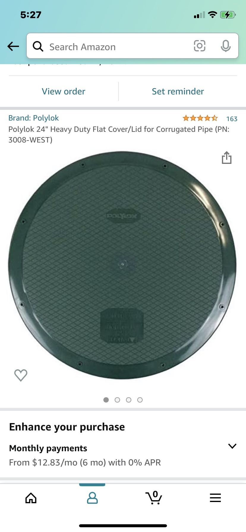 24" Heavy Duty Flat Cover/Lid for Corrugated Pipe *** NEW* ** never used still in original box from Amazon. Fit's 24" corrugated or ribbed pipe and most Polylok 24" products. (Inside diameter: 23.23" / Outside diameter: 26.52") Skid resistance surface Highest level of UV Protection included Includes a foam gasket for airtight and watertight Amazon price $85.152 with taxes and free Prime shipping