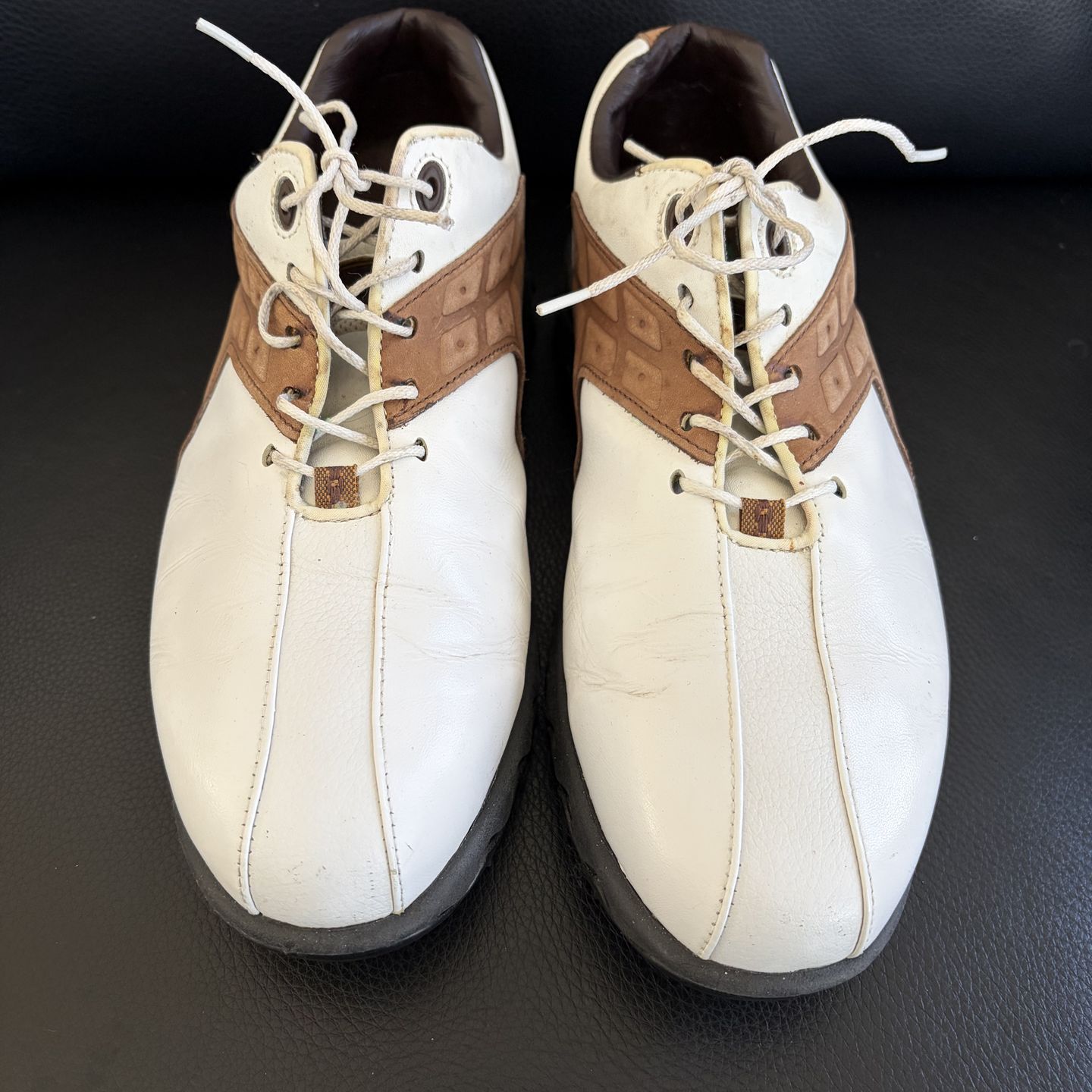 Sharp Classic White & Saddle waterproof Leather FootJoy Contour Series soft spike Golf Shoes in Excellent Condition. Men’s size 8 1/2 Wide nicely broken in, built with FootJoy quality and all day comfort. Ready for the Season. Shoes are clean, no damage or worn areas on leather. See detailed pictures. Save$ compared to lesser quality shoes.