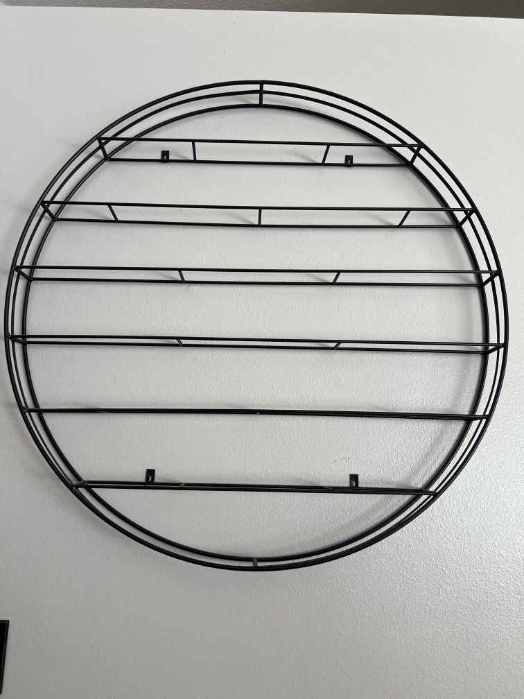 Large Wall-Mounted Circular Wine Rack – Black Metal Modern black metal wall-mounted wine rack in a circular design. Measures 38.5 inches in diameter (straight across). Holds multiple wine bottles horizontally and doubles as a statement wall piece. Perfect for a kitchen, dining room, home bar, or wine room. Details: • Diameter: 38.5 inches • Shape: Circle • Color: Black • Material: Metal • Wall mounted • Condition: Good