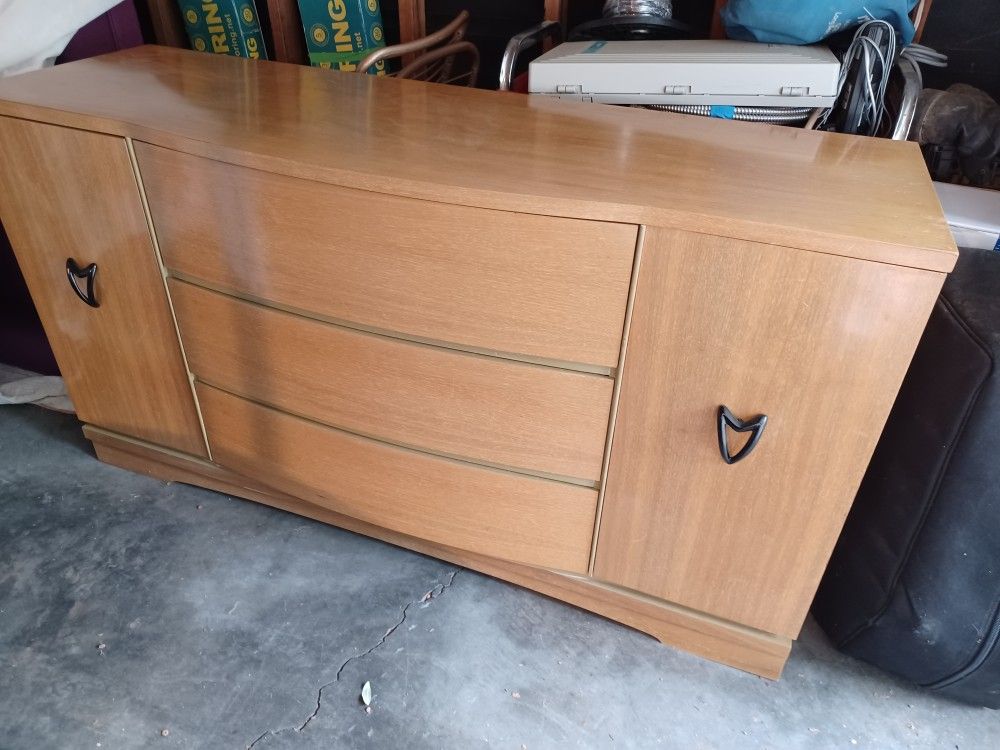 Vintage piece! Unbranded, very solid, all wood made, style is very similar to "Heywood Wakefield" curved front, integrated wooden drawer pulls, light warm finish, unit has 3 central drawers flanked by cabinets on either side, heavy pls bring help, if pics are up it's available W60 x H33 x D18