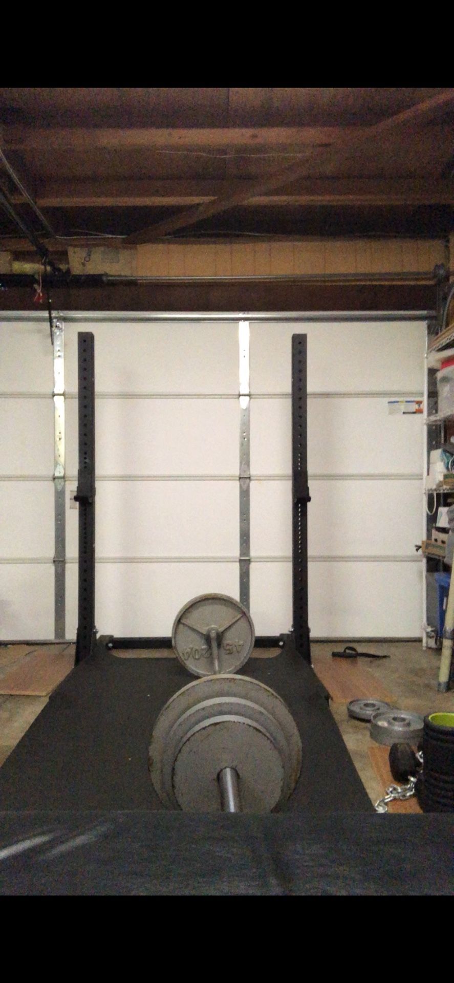 The full set up. Rogue S1 squat stand. Standard rogue Olympic bar (good condition). Pairs of 5s, 10s, 25s, 35s, 45s (~275 lbs on a bar?)