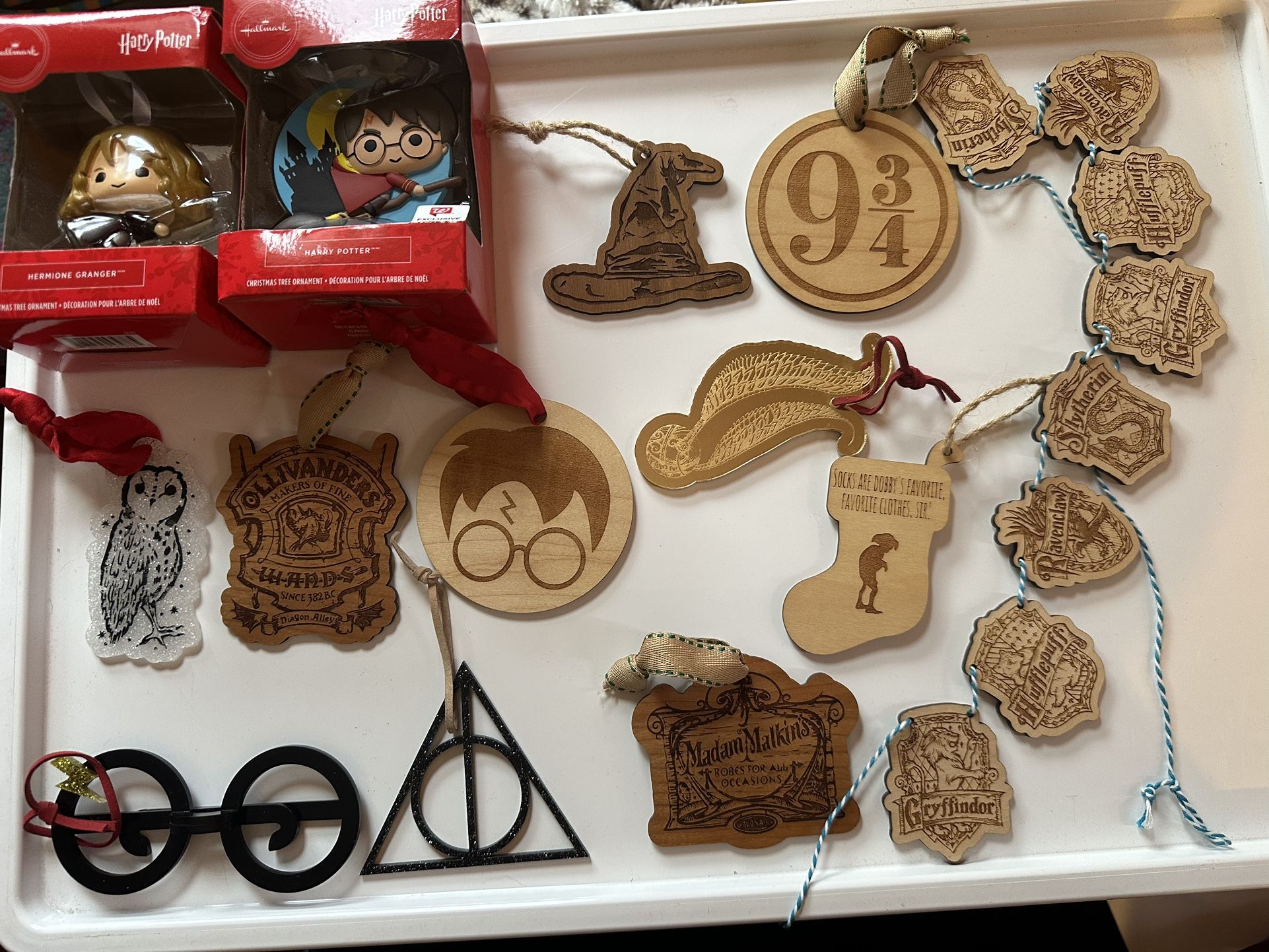 Harry Potter Christmas ornaments. Used once. Engraved on wood and/or resin. Including: Harry Potter’s face, Madam Malkin’s robes sign, deathly hallows, golden snitch, a string of two sets of the 4 house crests—Gryffindor, Ravenclaw, Hufflepuff, Slytherin, Harry potter’s glasses, Dobby’s sock, the sorting hat, Olivander’s Wand Shop sign, Hedwig, Platform 9 3/4, Harry Potter flying on a broom (unopened—brand new), Hermione Granger flying on a broom (unopened—brand new), and a mini book about Christmas at Hogwarts with a wreath that lights up with the wand included (in working condition). (I am selling a whole host of Harry Potter collectables. Check out my profile for more!)