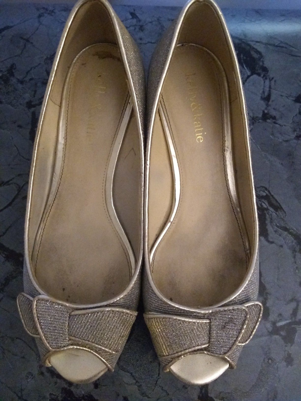 Beautiful gold and silver after 5 wedges. Peek e boo toe, with accent bow,cork wedge heel.