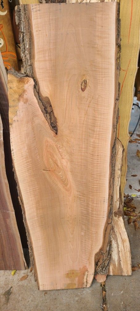 Extremely rare curly Bradford pear live-edge slab with true fiddleback figure running edge to edge. The grain shows tight, shimmering waves that absolutely explode under oil or finish, creating dramatic depth and movement across the entire face of the slab. The wood displays warm peach-to-salmon tones with a subtle honey glow, paired with long, uninterrupted grain flow that makes it very furniture-friendly. Natural live edges and bark pockets add organic character without disrupting the clean figure. This is true fruitwood curl — not stain, not dye, and not chatoyance trickery. Bradford pear almost never shows curl this consistent, especially in a slab this wide, which makes this a genuinely special piece. Species: Curly Bradford Pear (fruitwood) Dimensions: 48" length × 16" width × 1.5" thick Edge: Natural live edge Condition: Solid slab, air-dried Ideal for: Coffee table, bench, wall feature, custom furniture, or a statement woodworking project. Urban-sourced Iowa slab. Price: $400 Pickup: Gilbert, AZ Payment: Cash, Zelle, Venmo