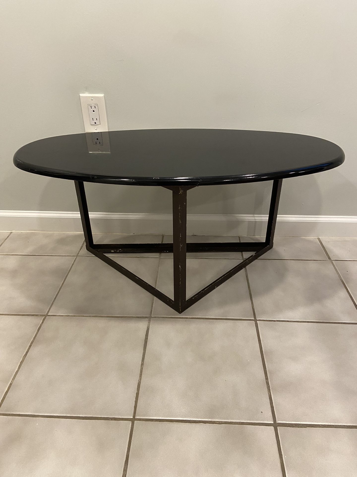 Modern black wooden top cocktail table with a industrial metal base used as is condition very structural sound top measure 36”w x18” depth 17” tall