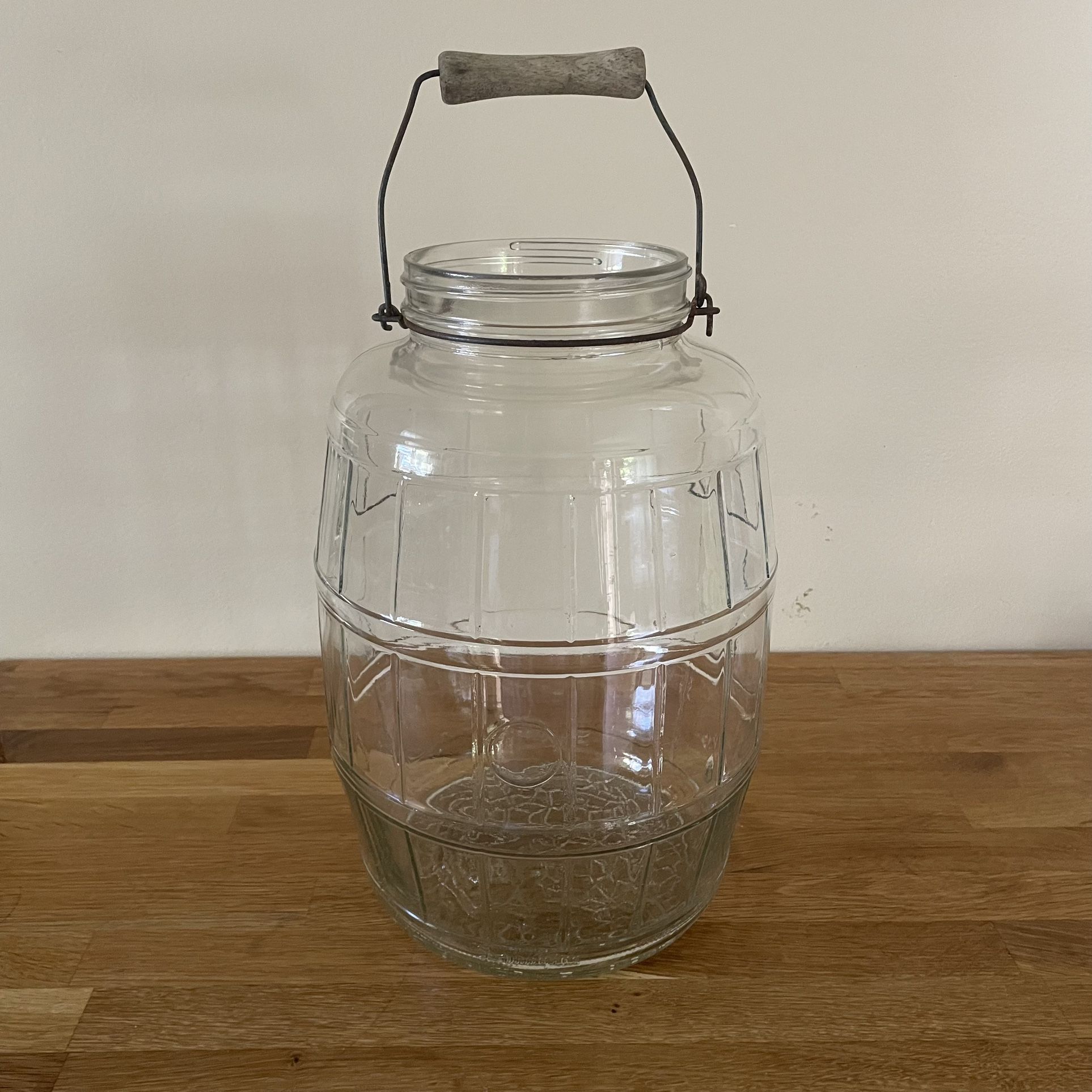 Pick up in Bellflower, Ca Vintage 3 gallon glass pickle jar from Duraglass. The jar does not come with a lid and is 13 inches deep, 7 inches wide at the base and 5” wide at the mouth. It weighs 7 pounds and has a handle for easy carrying. The barrel is an original Duraglass product and was manufactured in the United States between 1920 and 1949. In good vintage condition. No chips or cracks. Handle is rusted which adds to charm of the piece.