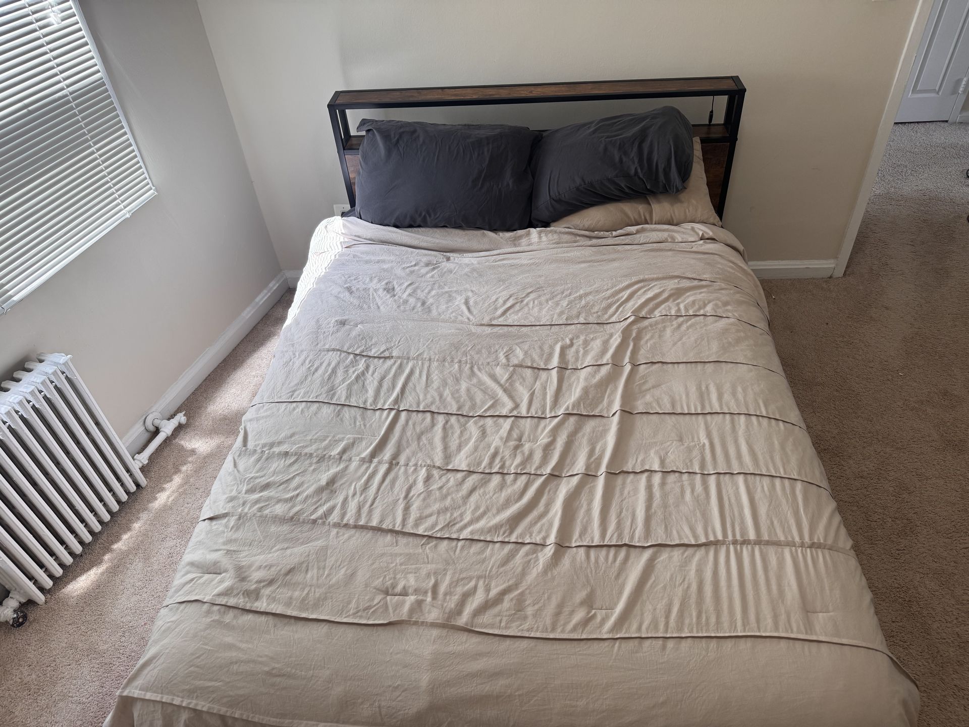 Queen Bed Frame with Headboard, Metal Platform Bed Frame with 4 Storage Drawers, Built in Charging Station & LED, Noise-Free/Metal Support/No Box Spring Needed, Vintage Brown Amazon $200 Me $125 Bed is dis assembled .. all screws are in the bag. All pieces are accounted for