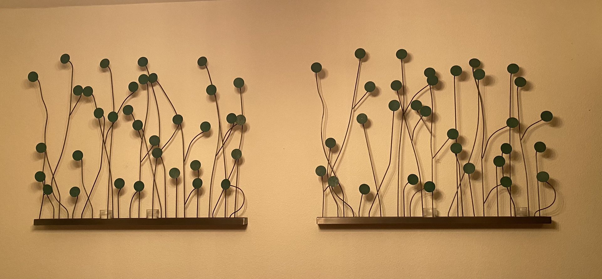 Unique wall art sculptures. They also hold votive candles! The wire floral pieces are removable and can be arranged differently according to your liking. Each sculpture measures 36”W x 28.5”H x 3.25”D Sold as a pair only. Pick up in Studio City, 91604 *Cash only*