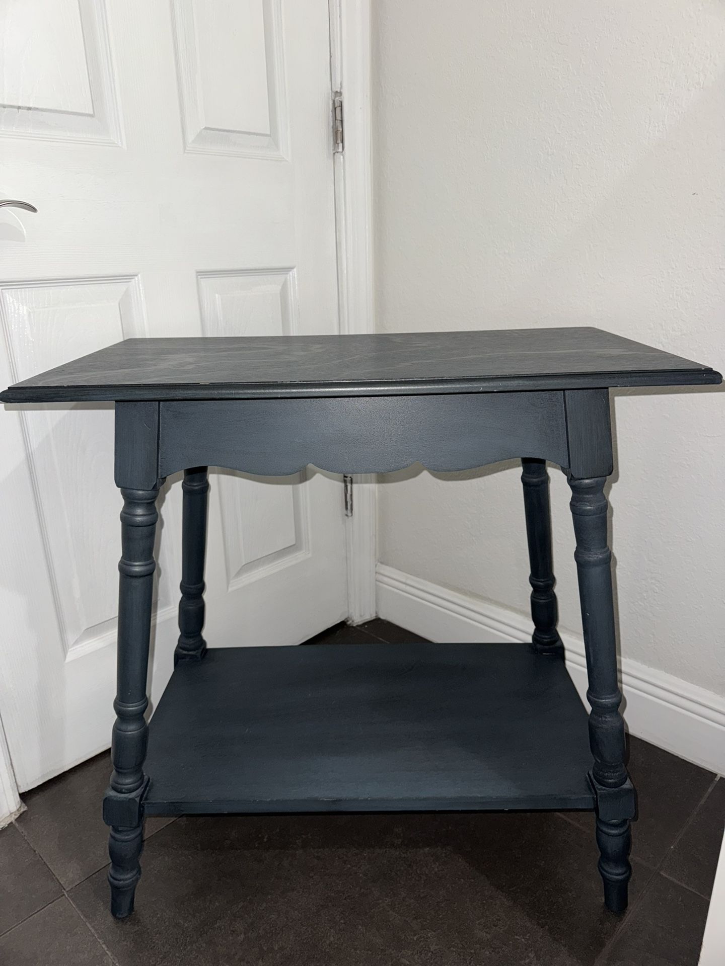 Blue wood side/entrance table. Good condition. All wood, 2 shelves.