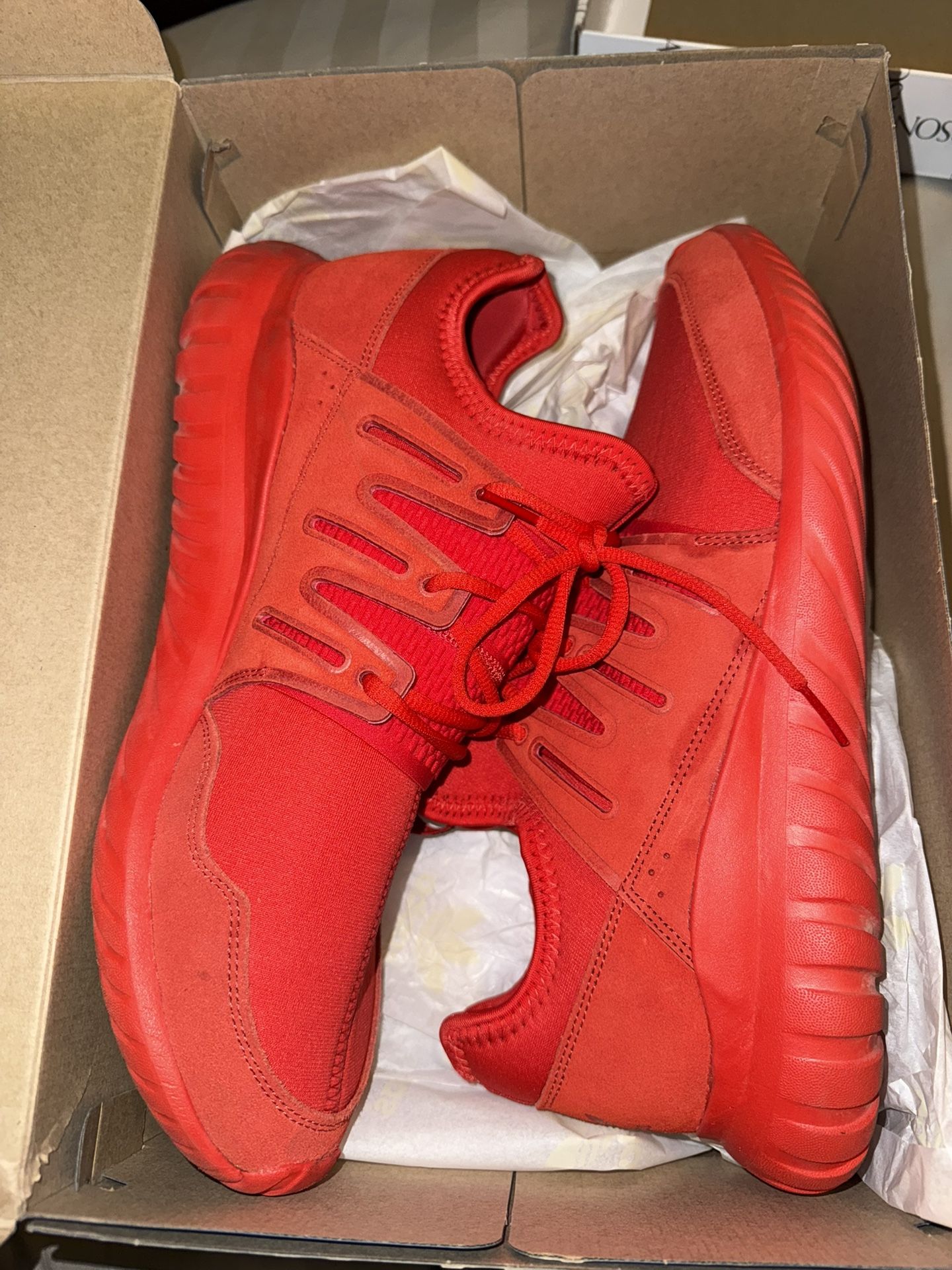 Vibrant red sneakers for active. Durable and supportive design. Perfect for everyday wear. Worn Size 12