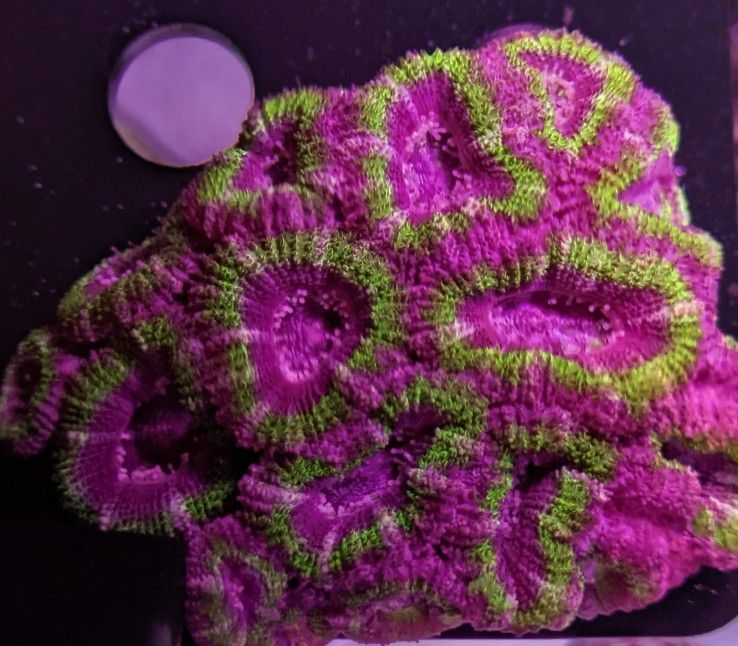 Vibrant acan (Micromussa lordhowensis) with deep pink/purple flesh and bright neon green rings. Thick, healthy tissue and excellent inflation. Strong coloration under blue lighting and feeds aggressively. Multiple full, healthy polyps Excellent color contrast Fully healed and established Pest-free LPS coral – low to moderate light and flow Great centerpiece acan — not a tiny frag. Local pickup only