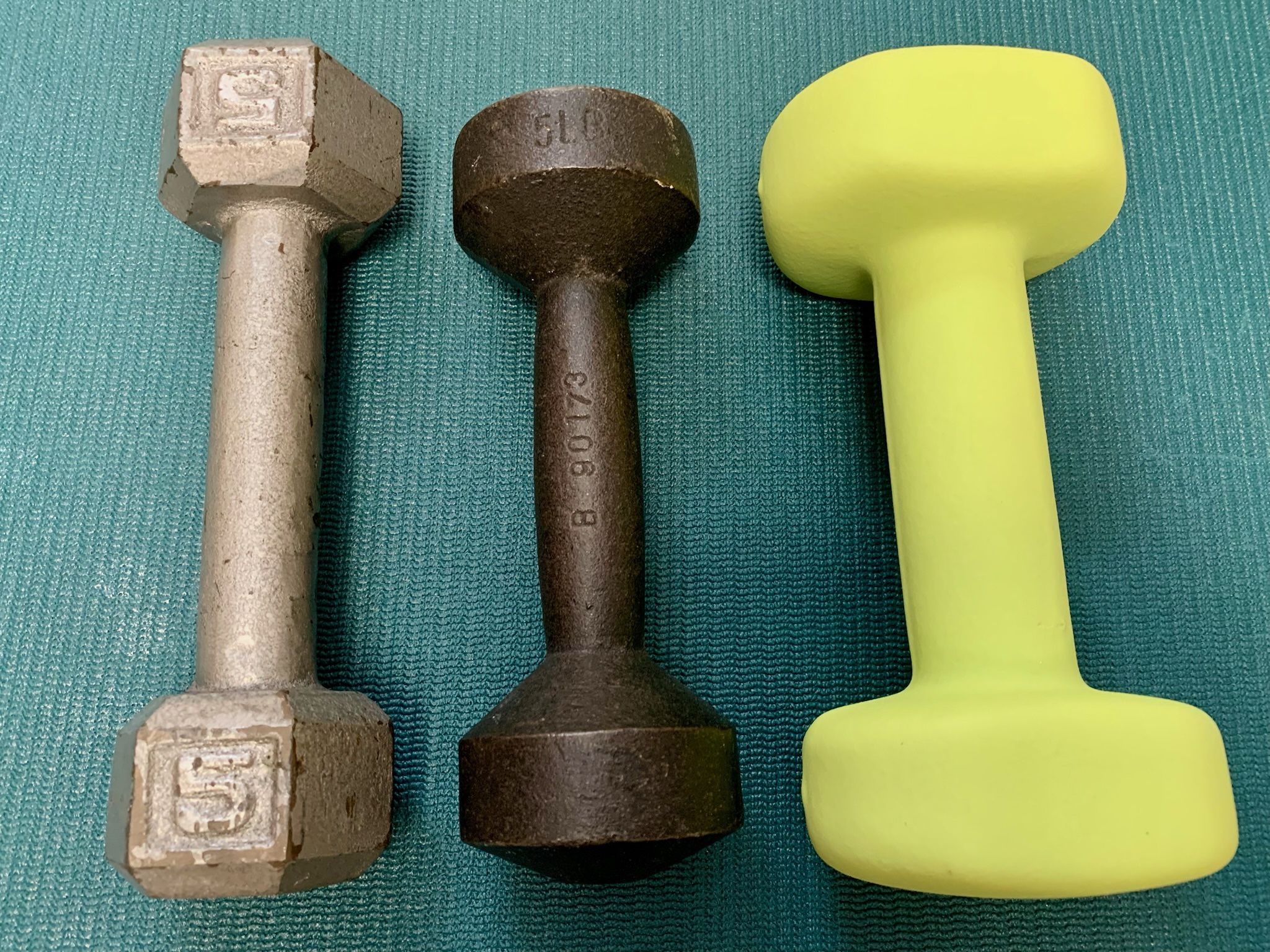 Set of 3 dumbbells: two 5 lb. weights and one 8lb. weight. All are in good condition.