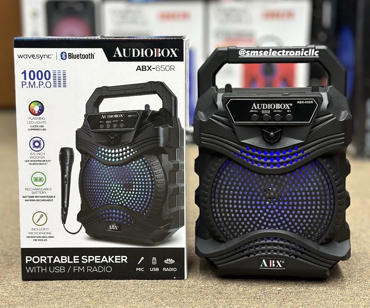 - Built-in cell phone holder - WaveSync™ Technology - Sound Activated 7 Color Woofer LED with Dedicated Switch - Dual Channel Sound Board - Main Channel: Bluetooth, USB, TF, FM, or AUX with Volume Control - Auxiliary Input: 3.5mm Jack - One 1/4″ Microphone Jack - 6.5″ Woofer - Music Power: 1000 Watts - Built-In 800 mAh 3.7V Lithium-Ion Rechargeable Battery - Grab Handle - Wired Mic and Charge Cable Included