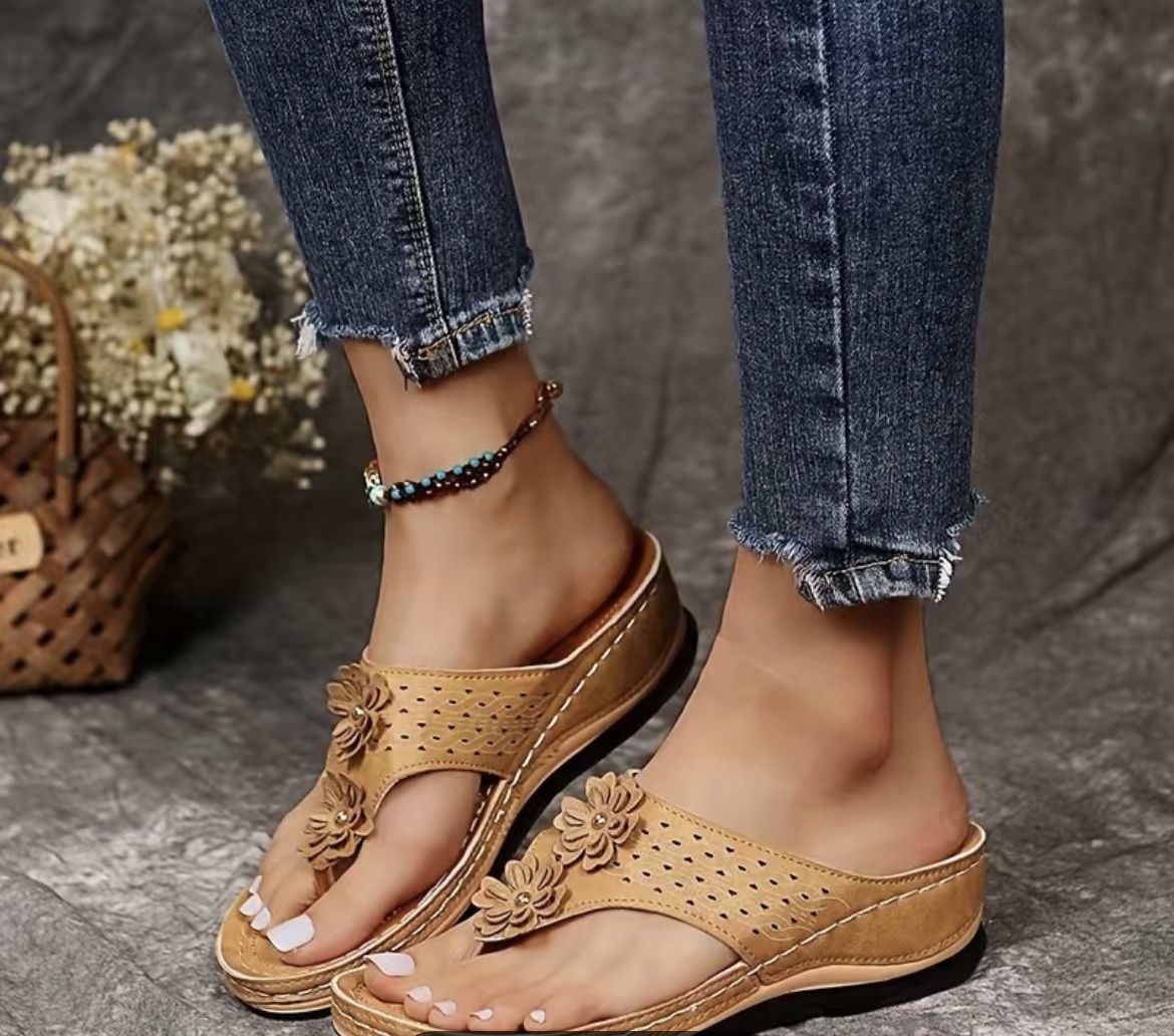 Size 38 Women's Floral Decor Thong Sandals, Solid Color Slip On Soft Retro Wedge Slides Shoes, Versatile Comfy Daily Footwear