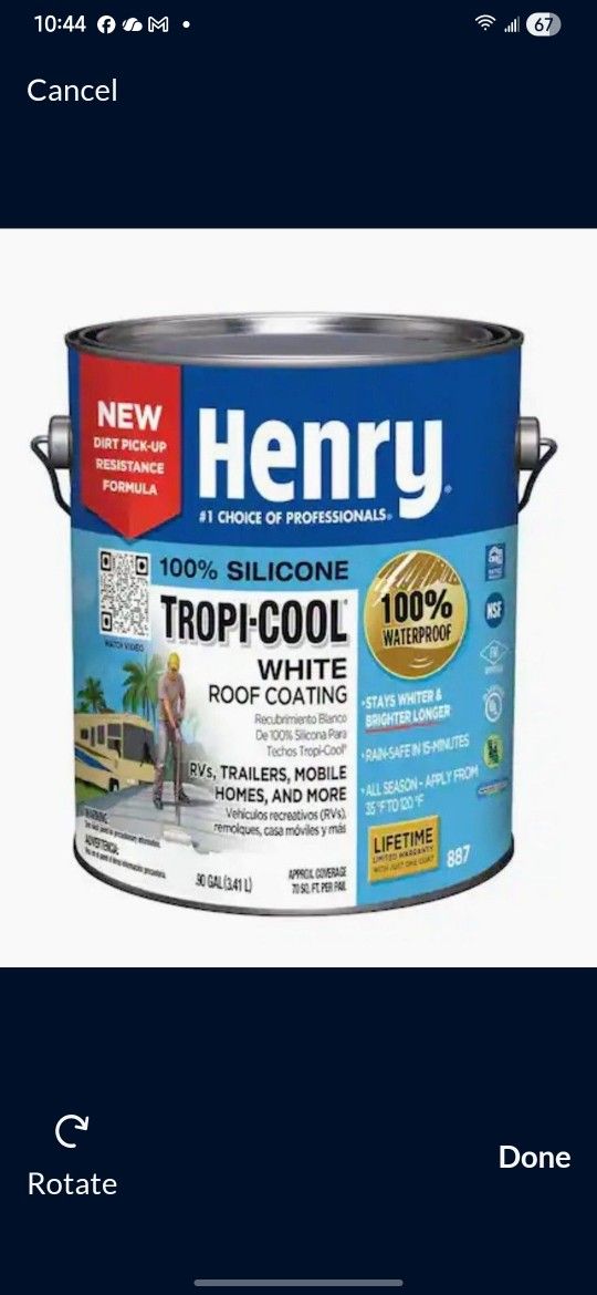 I have (3) 1 gallon buckets $60 for each one. Designed for waterproofing and reflecting heat on RVs, trailers, and mobile homes. Technology: Features a moisture-cure technology that creates a permanent, waterproof seal that is resistant to ponding water. Performance: Rated to be rain-safe within 15 minutes of application and includes dirt pick-up resistance formula to stay whiter and brighter longer. Specifications: Offers a lifetime limited warranty and can be applied in temperatures ranging from \(35^{\circ }F\) to \(120^{\circ }F\).